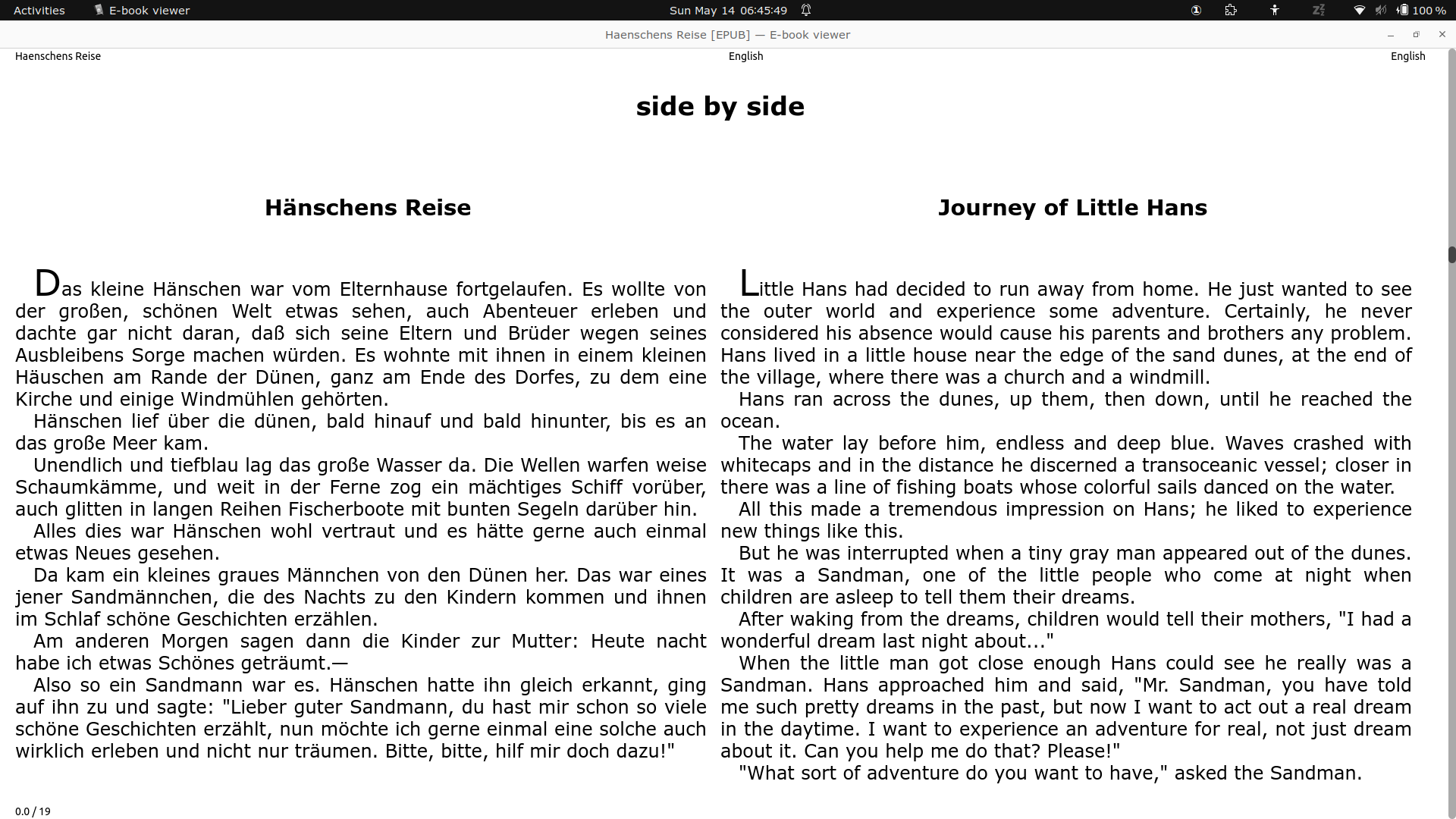 <style>h1 {clear: both; font-size: 1.4em; margin: 0; padding: 1em 0 2em; text-align: center;} h2 { font-size: 1.2em; margin: 0; padding: 1em 0 2em; text-align: center;} p { font-size: 1em; text-align: justify; margin-bottom: 1em;} .col1, col2 {float: left; width:50%} div.col1 p, div.col2 p {margin-left:0; margin-right: 0.75em}</style> <h1></h1> <div class="col1"> <h2></h2> <p></p> <p></p> </div> <div class="col2"> <h2></h2> <p></p> <p></p> </div> Paste text of language one after the first h2. Paste text of language two after second h2. Adjust styles as needed. Can print out very well as pdf. Works well with calibre reader. Probably won't work with Amazon ebooks. To adjust for English being more compact than German, reset widths separately to 45% and 55%. Best regards, Pop |