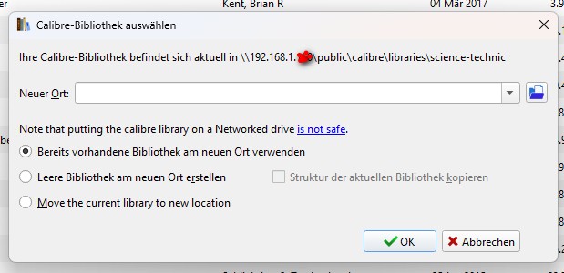 Run Calibre 6.21 on my win11 laptop, few different libraries (science, diy, belletristic,...) are on an external HD to manage them and yes, it works well. From time to time I synchro these libs with the libs I have on another HD connected to a Raspberry Pi running in my local network. So different laptops in my network have access to all the libraries as well. All worked fine until the last synchro of my belletristic lib, then get this error: PermissionError:[WinError 5] Access is denied: '\\\\192.168.1.xxx\\public\\calibre\\libraries\\be lletristik\\.caltrash' And yes: .caltrash folder has read and write permissions And yes: folder has the right user and group And no: No other running laptop running Calibre at the same time, just one Calibre running And yes: Start Calibre on windows as Admin. Can load my other lib (example science, diy, kitchen,...) with no problem, but find out they don't have this .caltrash folder. So have no idea what can I do now, but really hope one knows. Appreciate your help very much. |