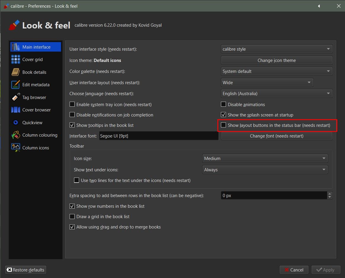 I did miss the option you point out, I'll definitely try it thanks! I'll put in a feature request, though I agree that it might not merit attention if no one else has had an issue. https://bugs.launchpad.net/calibre/+bug/2026636 I didn't realize that layouts existed until I had to figure out how to get back the book details pane after I accidentally collapsed it. It would be good to highlight the layout button or at least give it a unique icon (as it's currently sharing one with preferences.) [Edit: It seems that's what the option does, it displays the useful icons!] Last edited by arpeggioaccele; 07-09-2023 at 01:15 AM. |