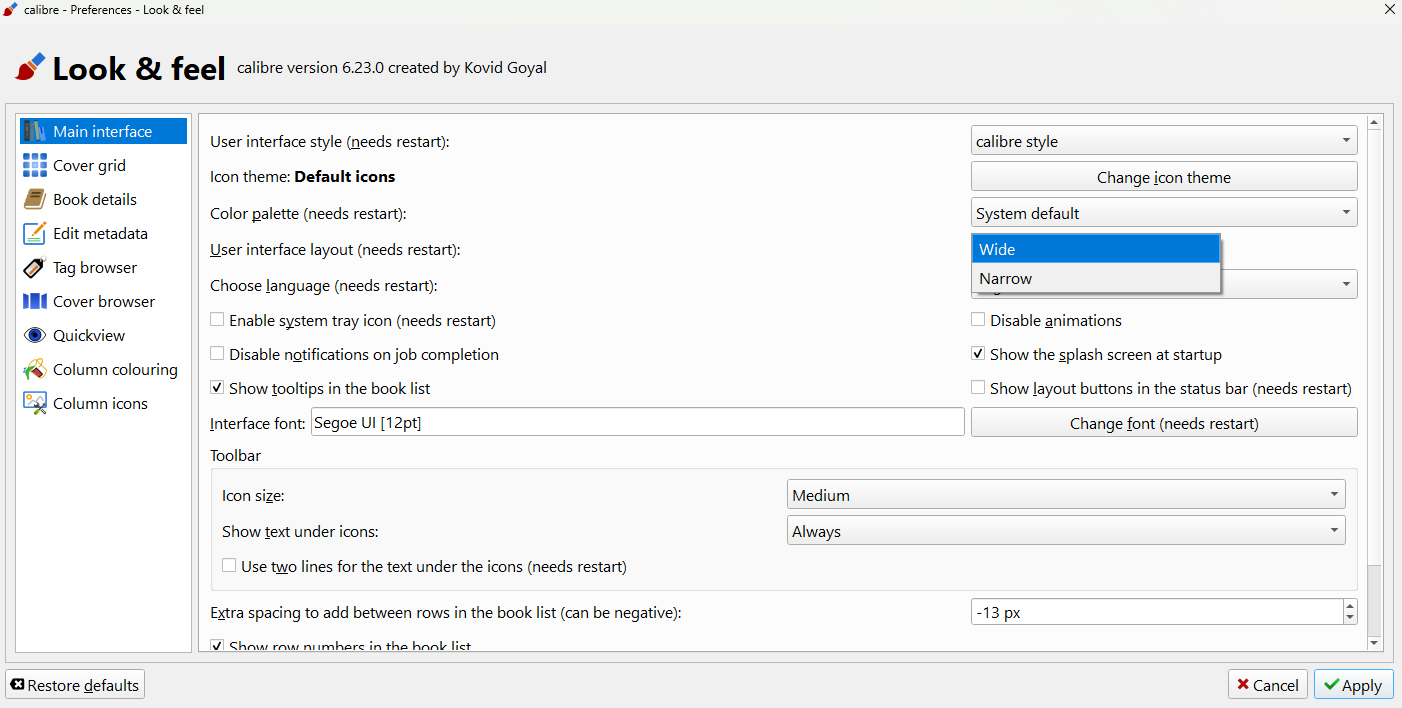Hey all! I had to reset my Win10 PC (where I keep my library) and I'm trying to get back to how I had it. I guess not all the settings get saved with the library.  Where can I specify that the book detail panel should be hortizontal along the bottom, instead of vertically along a side? I've been through every setting (I think?) and I cannot find one that will do what I did before. (Real clear, I know.) Thanks y'all! I'm just too frazzled from the reset -- I'm probably staring right at it. Anne |