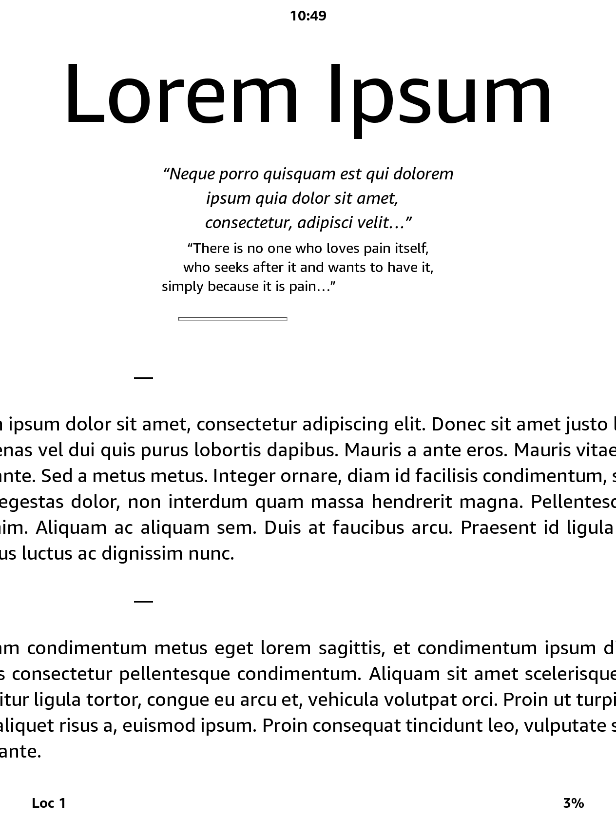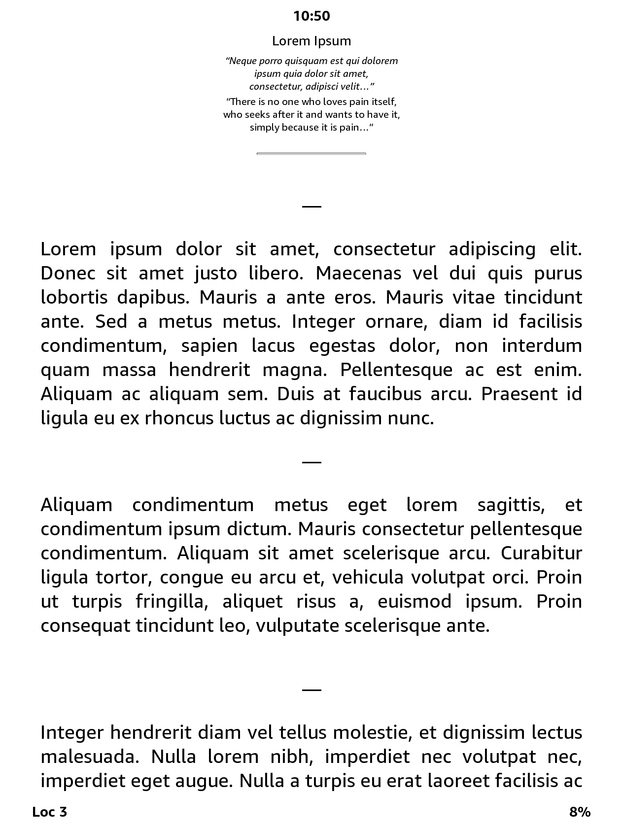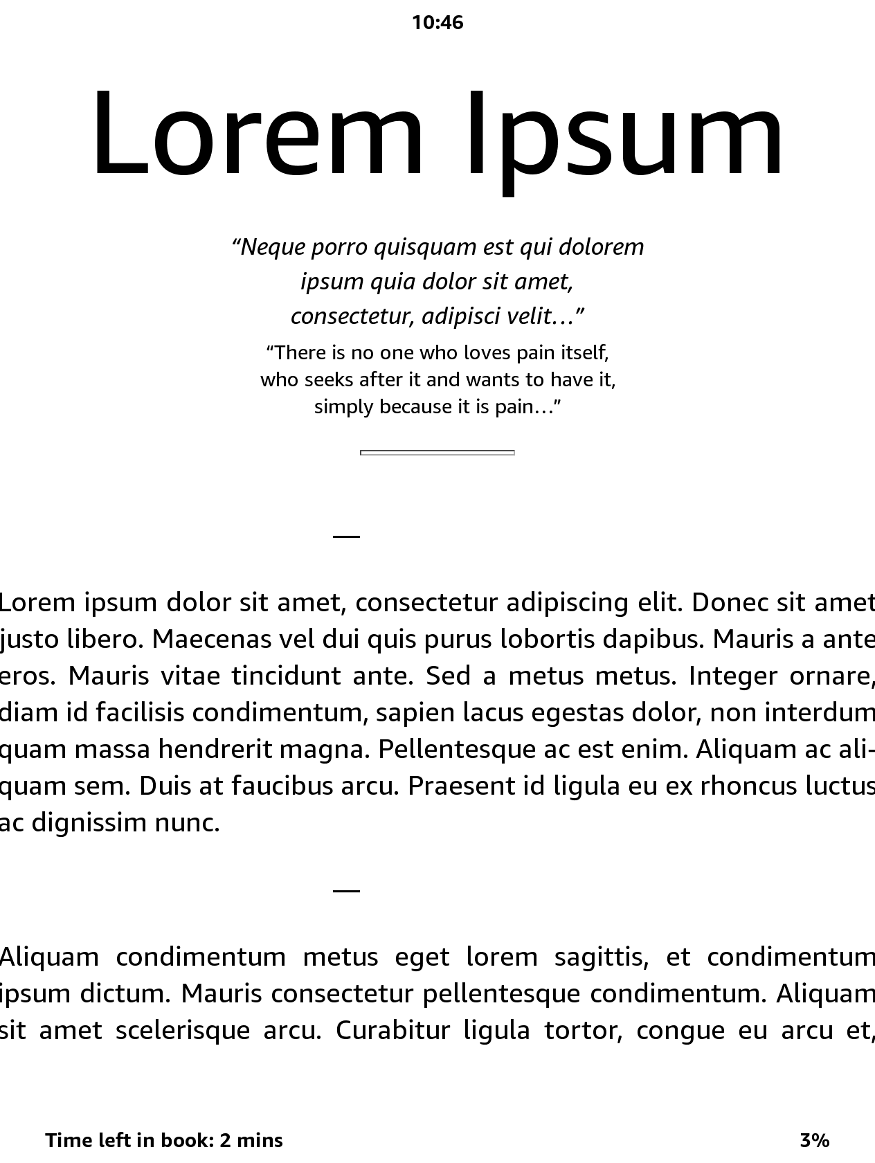 another KFX-weirdness on the Kindle. I use an EM Dash as a character for Transitions / Scene Breaks. On the Kindle Reader using KFX format e-books, the dash is always about 1 cm too much to the left (see screenshot) if I set negative margins (more on that below). No such problem with AZW3 or the Calibre viewer. Even if the EM Dash is in a blockquote with other text that is properly centered, the dash itself is about 1 cm to the left of the center. No text indents, no padding, etc. After some playing with settings I noticed the following: - confirmed: issue only appears with KFX format on Kindle. You can't see it with AZW3 files, nor in the Calibre viewer. - issue appears when I use negative margins on body text during conversion from ePub to KFX (I do this to reduce the way-too-large-for-me Kindle default margins which really annoy me). - same issue if I use other characters - the issue doe NOT occur, however, with full paragraphs of text used e.g. in a Chapter intro, quotes or poems. They are all centered correctly. - I first though the issue did not affect "<hr>" lines, but it does -- only less strongly - they move less far to the left and only when I set stupidly low negative margins, not my normal "-1.5". - code for negative margins during conversion ("extra CSS"): Code: