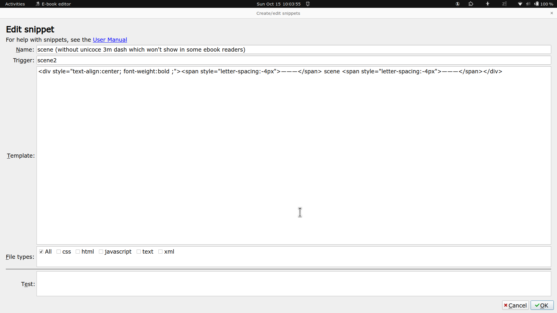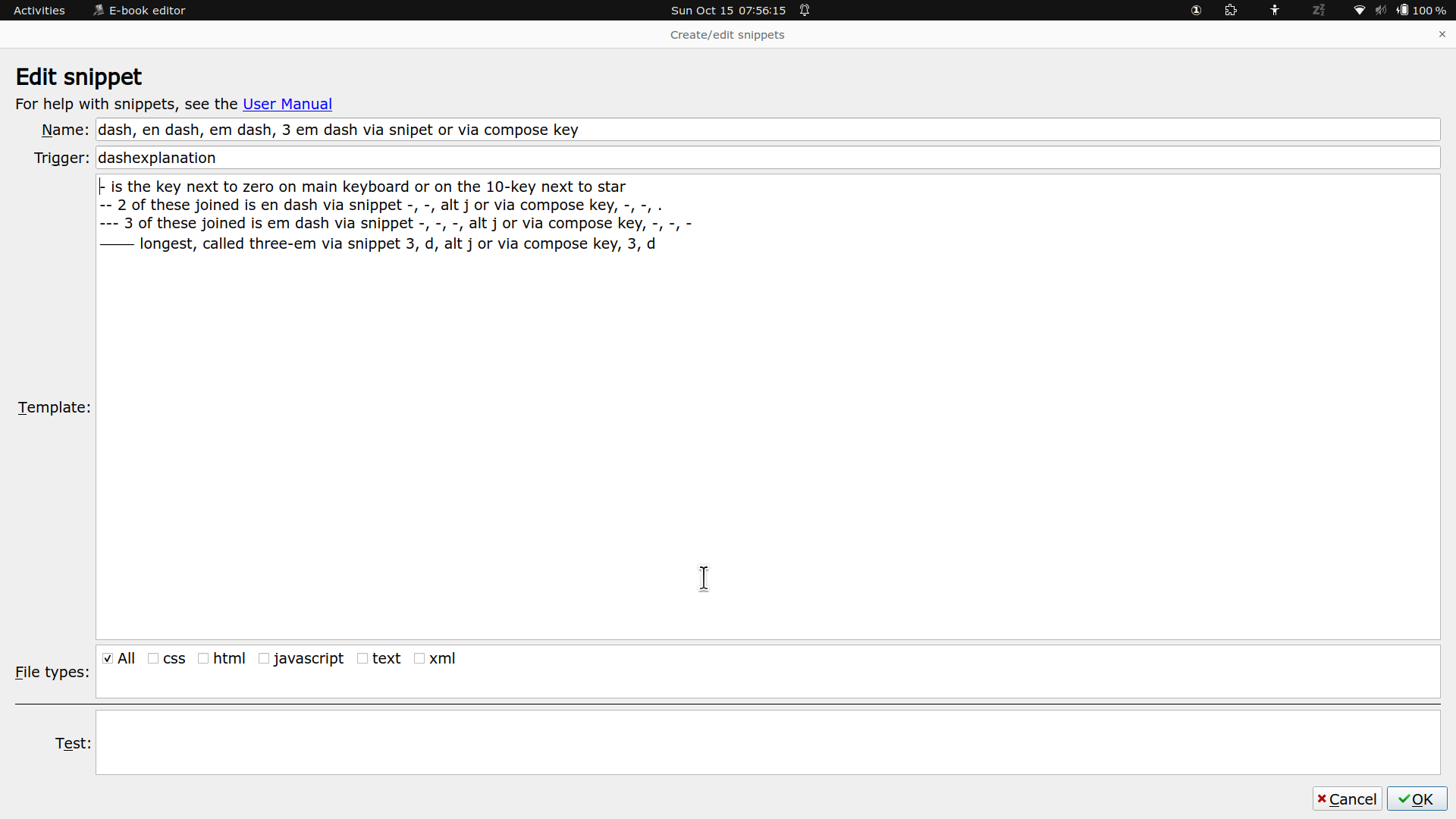 I use en dash and em dash quite a bit. To make them I employ both the calibre snippets and also .XCompose. I found out to my horror from a prior post reply that Amazon will not recognize the em dash, so I fudge it by 'running together' 3 regular dashes with a span whose spacing has been reduced. I use the triple sometimes to surround page numbers at bottom of PDF pages. You can set up an .XCompose file in Home and use it elsewhere (not just calibre tag editor). While in calibre I prefer using snippets for en and em dashes. I break USA convention (if, indeed, those rules still apply) by separating like this: text space en dash space text. That is, I do not allow the en dash to touch text (as is the convention). I find that it is even worse looking when done as follows: text comma en dash space text. This was done frequently a century ago by many authors. Or, maybe the type setter did this. I use the triple dash like this for mid-chapter centered scene breaks: em dash space scene space em dash. Best regards, Pop