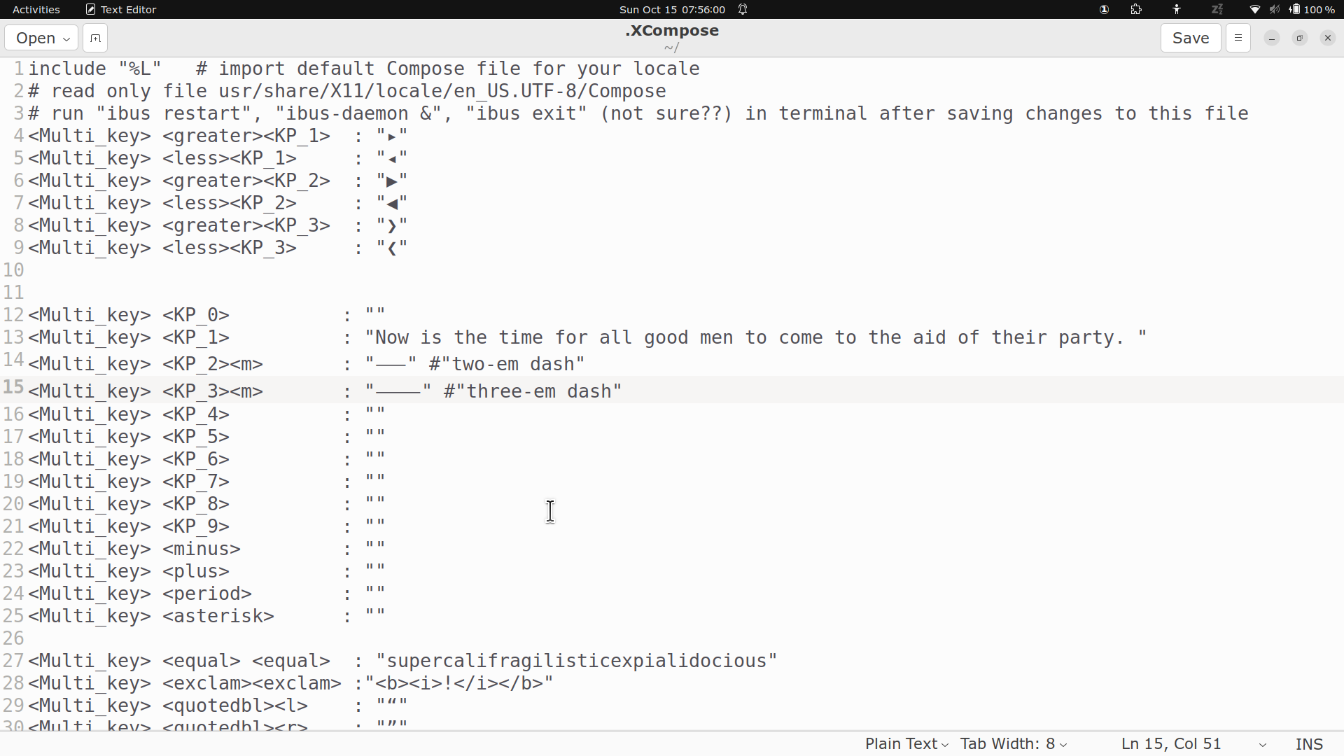 On Linux I disable Caps Lock Key, both shift is Caps lock, either cancels and then Compose mapped to Caps Lock Key. The Compose --- is em and Compose --. is en as standard. I do have a custom .Xcompose too, but only needed for Greek, prime, double prime like 6′ 2″ ( Using Compose 0 ' and Compose 0 ", where 0 is Zero.) and a few other unusual things as Alt Gr and Compose cover Spanish, French, German, Polish, Icelandic etc. I've no need to type Hebrew, Arabic, Thai, Hindi, "modern" Korean or Cyrillic, but these can be done by swapping layouts or in .Xcompose. The advantage of .Xcompose is using a transliteration rather than official language layout. Years ago I made my own layouts using MS Keyboard Editor thing on XP to match the AltGr of Linux. I've no idea why the regular MS UK or US layouts are so limited. Last edited by Quoth; 10-15-2023 at 11:44 AM. |