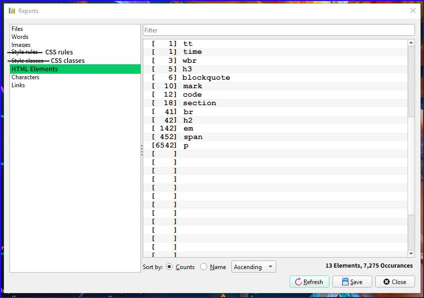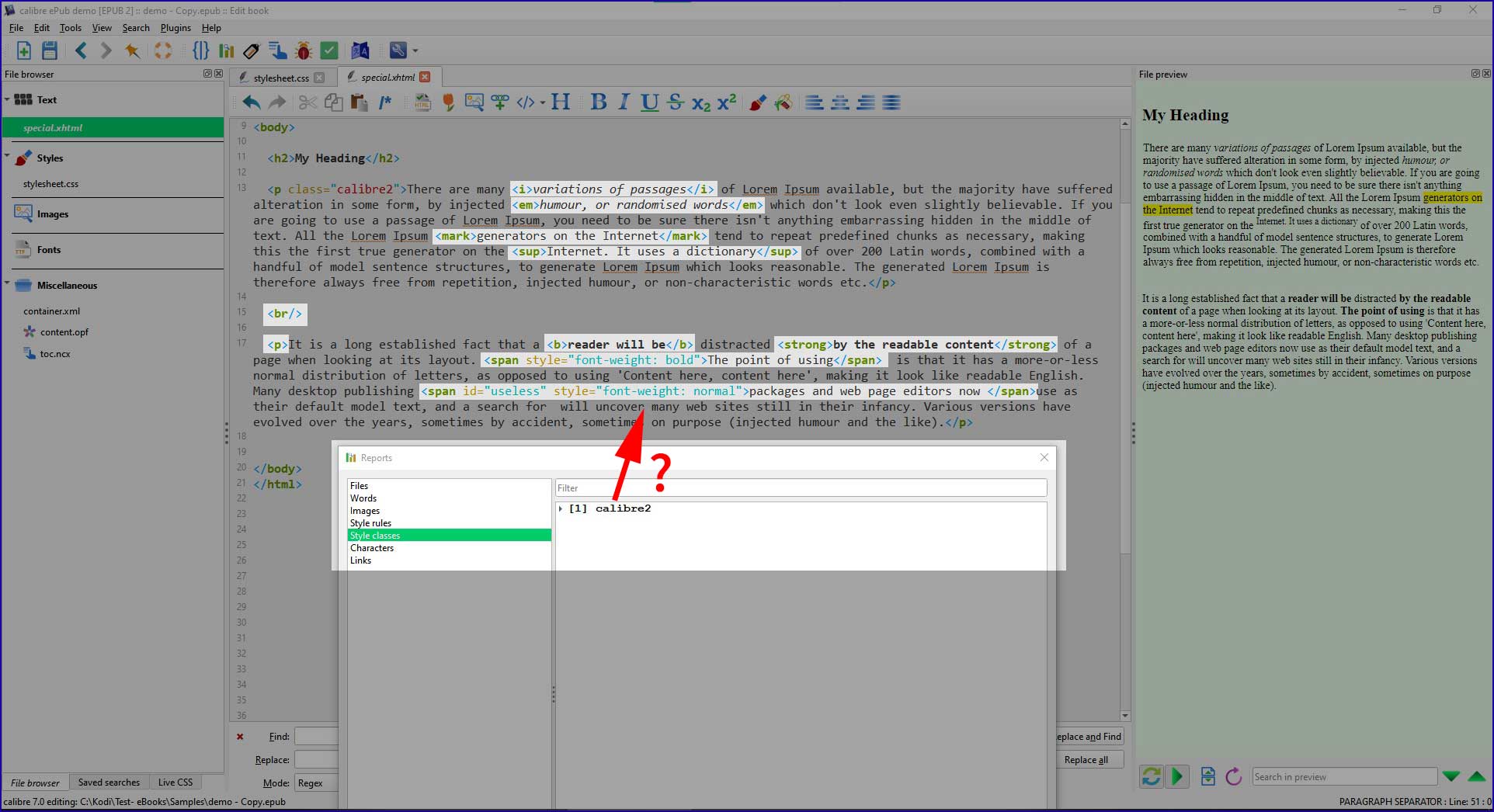 I am surprised that you think there is too little use for a tag report, as users can very quickly spot tags that need investigating. Personally, I have been caught out so many times- that tag which is used once, and makes you wonder why it is even there. Yep, I did think the style attributes might get a bit confusing, considering all the possibilities. Maybe list only the style="" occurrances? Anything with class="" will be captured in the style classes report anyway. Maybe a report that also lists all id="" used in the ebook? I know many members will think, "geez, just bloody search for them". Sure, but if you don't know they are there, then you don't know what to search for, or even consider searching. Oh well, maybe one day but thanks for the response.