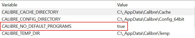 And the CALIBRE_NO_DEFAULT_PROGRAMS Environment variable ==>> https://manual.calibre-ebook.com/cus...ment-variables BR |