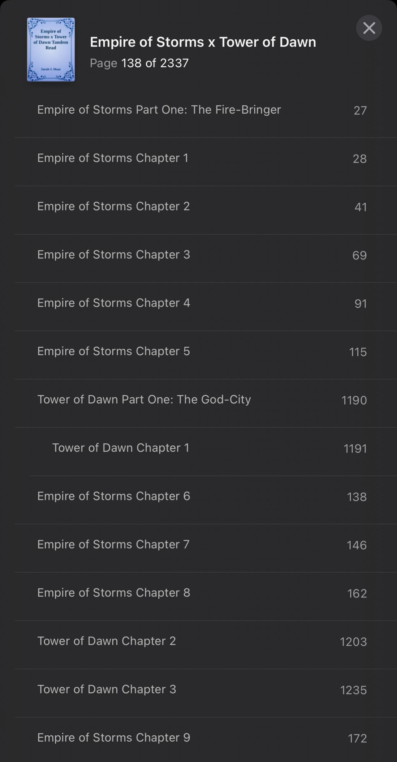 I’m planning to do a tandem read on 2 books and some chapters overlap between them thus the need to rearrange the chapters. I succeeded in merging the two ebooks and re-arranging the chapters, however, I noticed that the page numbers are wrong (they retain the original page numbers when they merged, not when the TOC was arranged). The book progress also follows the original flow that’s why it came out wrong. Can I fix it? Here’s the picture for your reference. Sorry for the noob question. I just want to enhance my reading experience so I don’t need to switch the books every now and then. Thanks in advance for your help! 🙏🏼 |