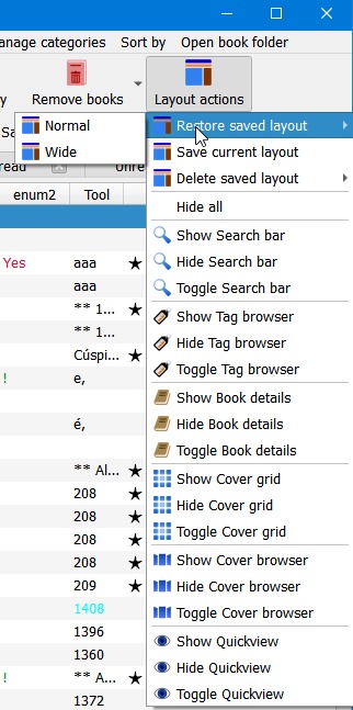 I added the ability to save and restore the GUI pane layout, including Narrow/Wide, what panes show, the pane sizes, and where supported by base calibre the pane positions. The new operations are added to the existing "Layout actions".