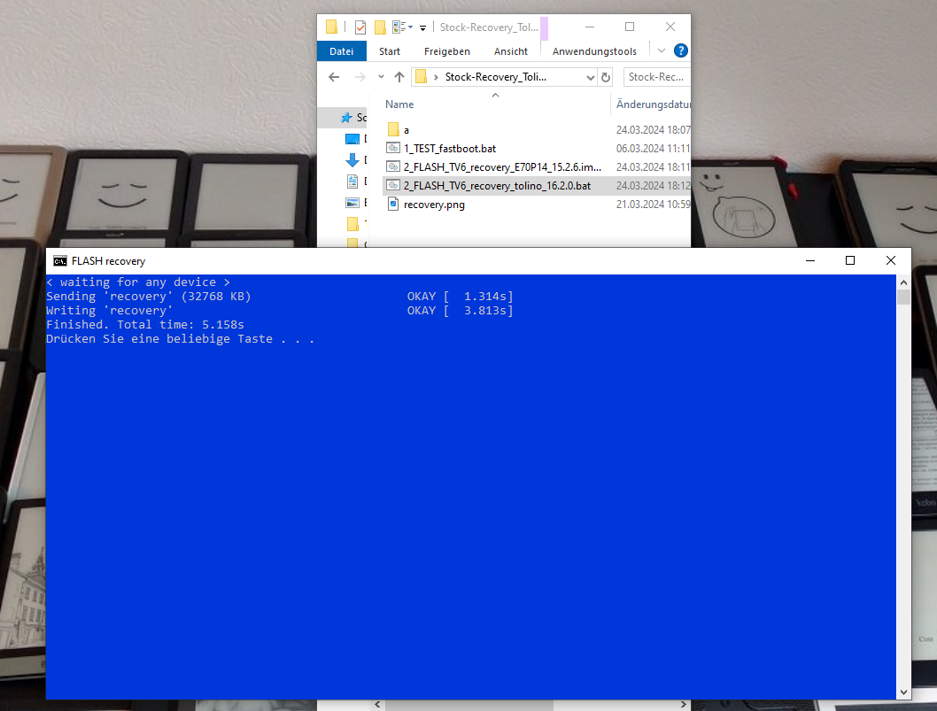 And you also cannot boot the device into recovery mode using hardware buttons? You can flash it in another way. https://mega.nz/file/fwchAQKR#AZ6mAx...mHBZ_P6U8na5Ow We connect Tolino to the PC. Turn off Tolino by holding the power-button for 10 - 15 seconds. Click 2_FLASH_TV6_recovery_tolino_16.2.0.bat. Now use the buttons (bottom page turn button + power-button) to boot into fastboot until the command is executed. Next, disconnect the Tolino from the PC and, using a long press on the bottom page turn button + power-button reboot from the mode fastboot to recovery mode. Last edited by Waldy; 02-16-2025 at 06:04 AM. |
