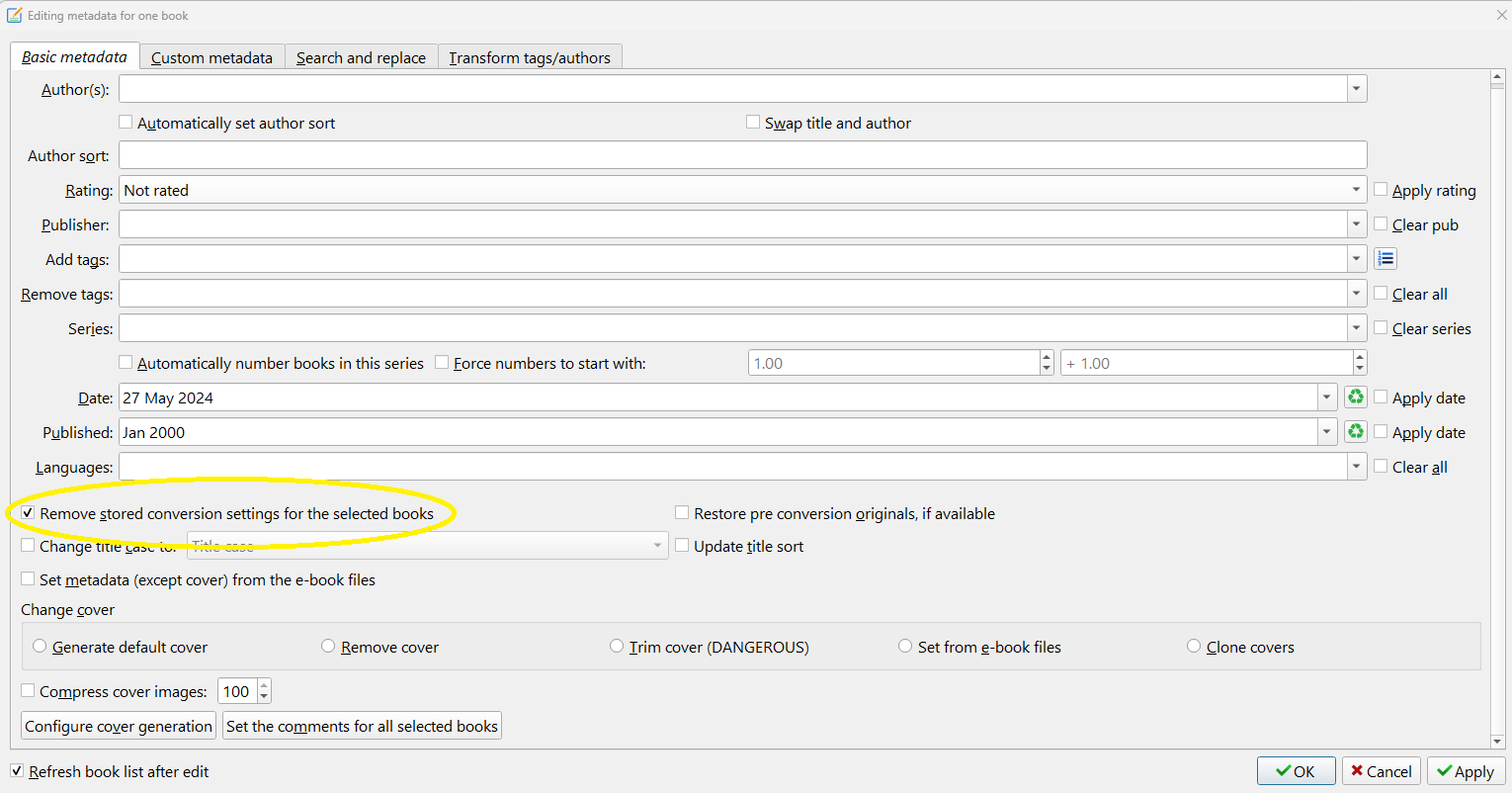 One other note is that if you are re-converting an ebook, the conversion settings are sticky. Use the edit metadata in bulk tool and check the Remove stored conversion settings box to remove them. Last edited by DNSB; 05-27-2024 at 03:22 PM. Reason: Added Sticky conversion settings removal comment |