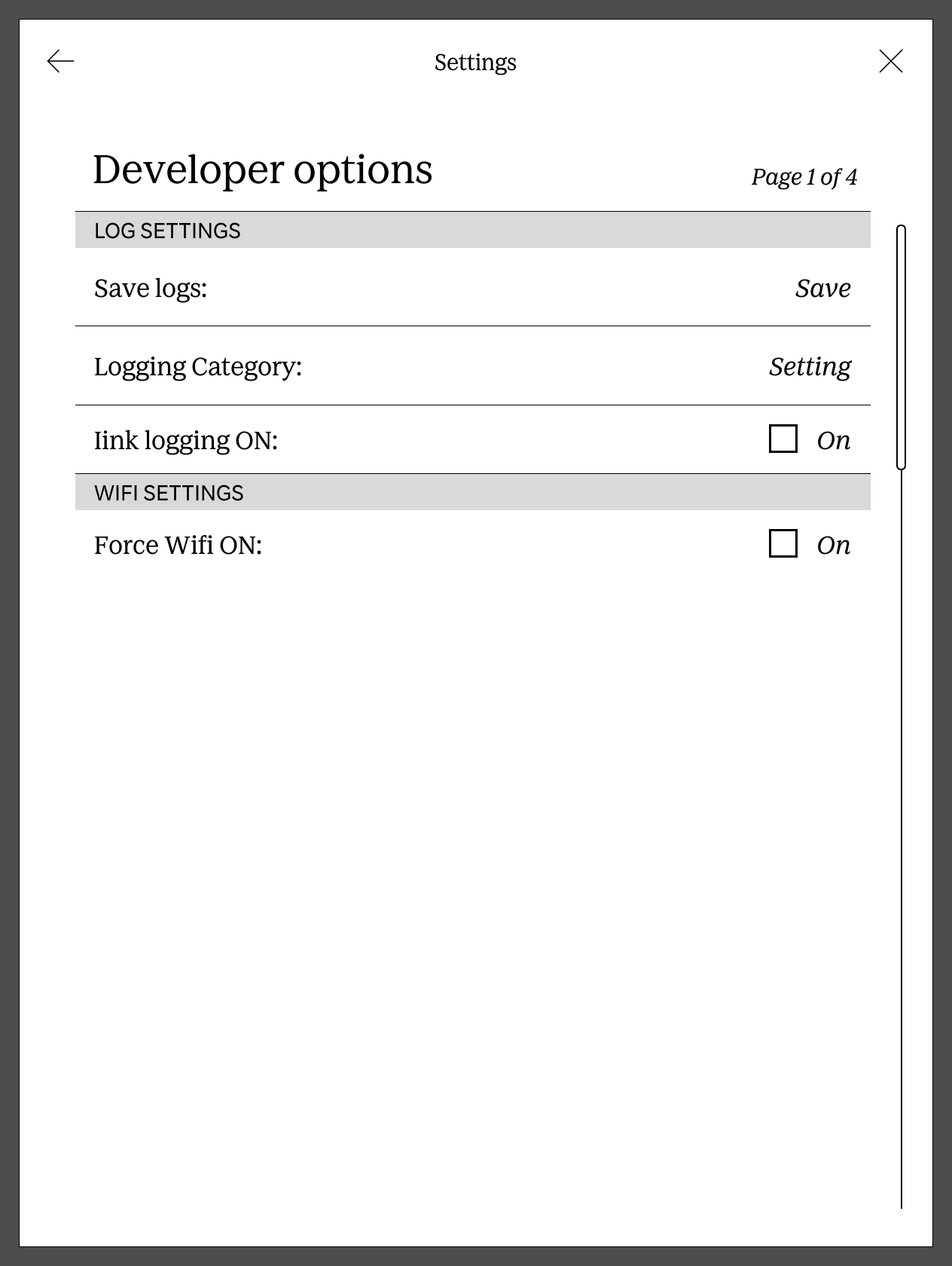 Also bei Kobo Clara HD geht das bei mir mit developer options, wie von beschrieben. invert mode kann da z.B. eingestellt werden.
