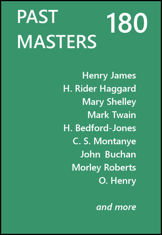 Some famous names in this issue of Past Masters, a magazine of fiction out of copyright in Life+70 years jurisdictions. Mary Wollstonecraft Shelley, Henry James, H Rider Haggard, John Buchan, H Bedford-Jones, O. Henry; and of course some less known and unknown authors, including the ever-reliable Anonymous. Approximately 100,000 words as usual.