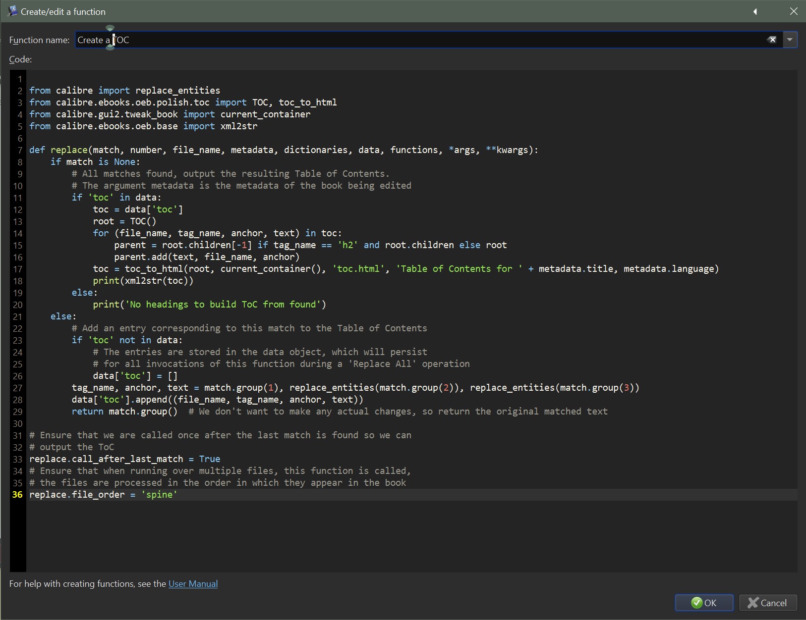 As for how many people have used their own functions in Calibre... that's hard/impossible to tell unless you monitor everyone's use of Calibre Editor ![]() There are several examples in Calibre's documentation on how to do different functions, and I think there is/was a thread for people to share any creative functions they thought of. I don't know that we would need to provide more than a couple default functions...but it seems that this is a much easier/simpler way for someone to create/use a plugin-light function. I know people who have a great idea on something that they would use regularly but get scared away when told they need to create a whole plugin...they may be able/willing to create a simple function instead. We could even add these shared functions to a thread/sticky (like regex-examples) so others could use them. Yes, it is possible to save the ePub, close Sigil, Open Editor, open the ePub, find/run the replace function, save the file, close Editor, Open Sigil, open the ePub, find where you were last editing and continue....oh, wait, There is another function I was supposed to do.... I honestly don't know all the particulars about C++, can it not import/run a python module? Doesn't the existing proof-of-concept Sigil plugin already show how to implement it in Sigil? |