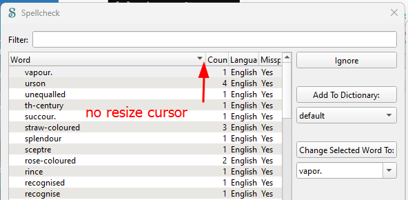 IIRC, someone requested changes to the spellcheck dialog box. These changes now make it impossible to resize the Word column because the column resizing cursor, which looks somewhat like this ←║║→ is no longer shown when I hover the cursor over the vertical divider bar between the word and count columns.