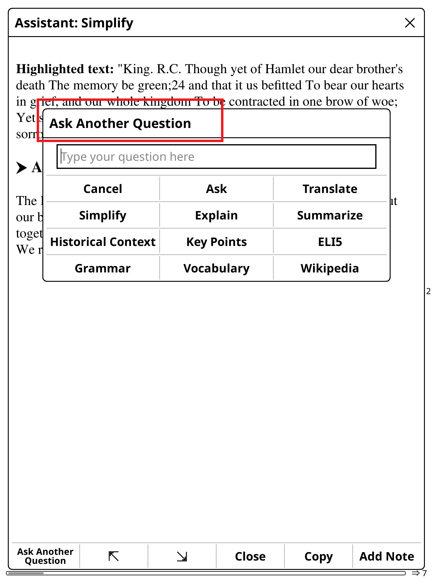 "Add to Note" and "Copy to Clipboard": Easily add whole dialog as a note to highlighted text or copy to use for later. Quick Access : Ability to access some of custom prompts directly from the main highlight menu (Configurable). Gesture-Enabled Prompts: You can assign gestures to Ask and Recap. You can access these prompts through a "quick menu" as well. |