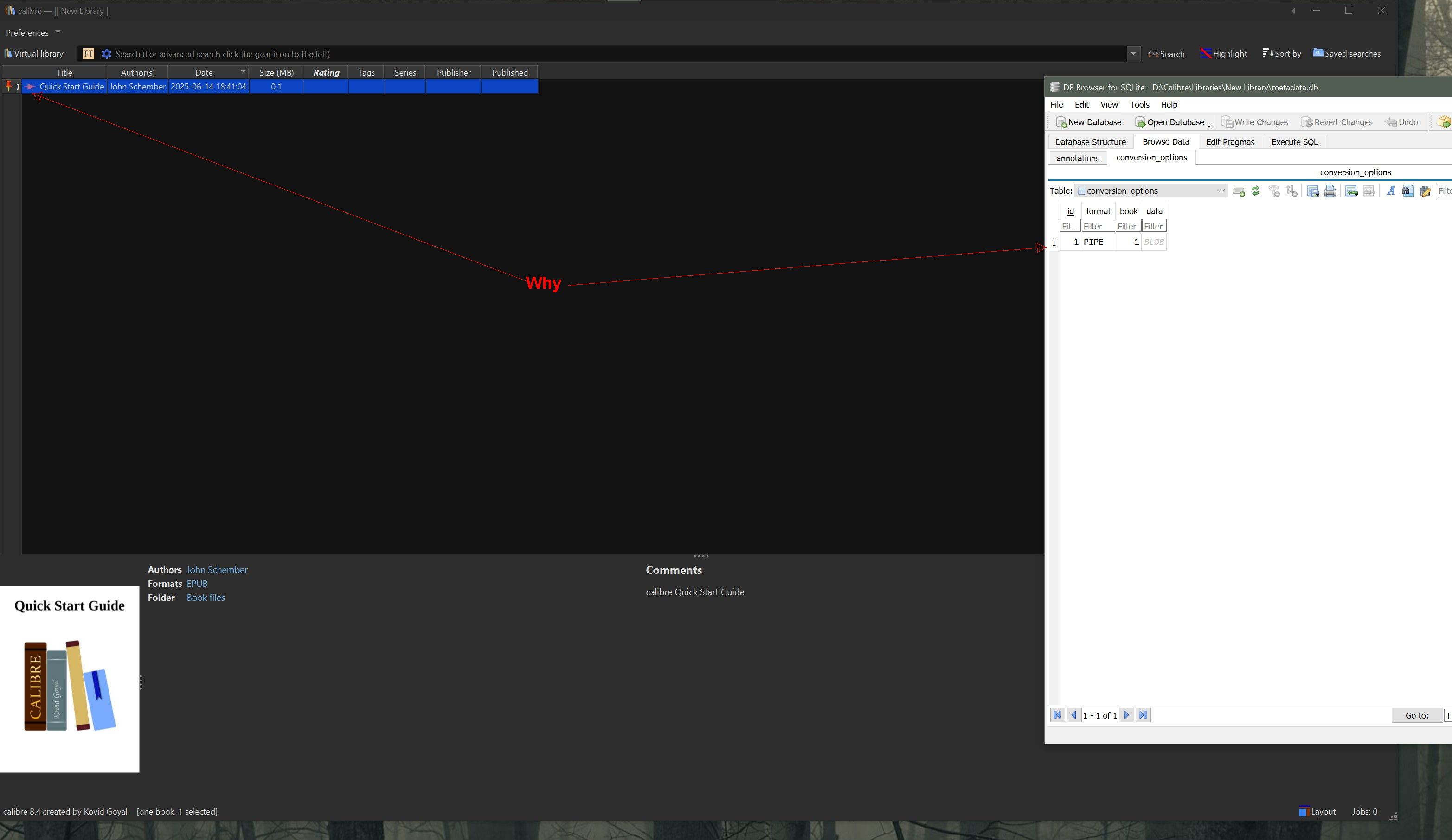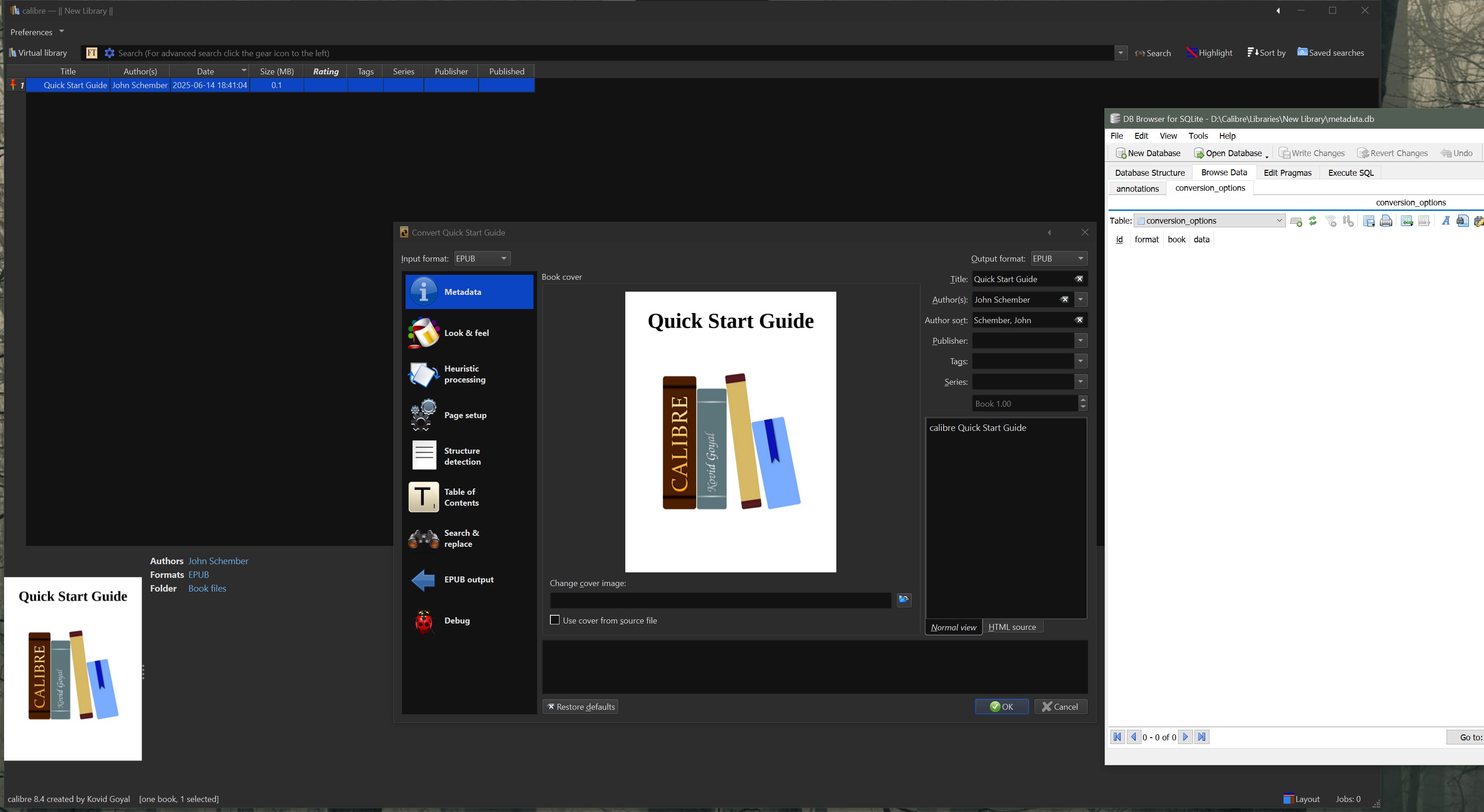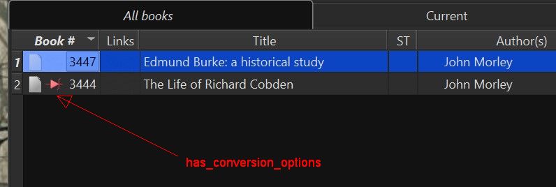 And if I revert to the Preferences settings more often than not I forget to remove 'conv-set' from #admin_tags. So, at irregular intervals I eyeball the results of a search for #admin_tags:"=conv-set" alongside the 'conversion_options' table in metadata_db. and make necessary corrections in the #admin-tags column. Can anyone suggest an easier, preferably automatic way to achieve the same result I looked in the template function doco, and JobSpy; and AFAICT Action Chains is unaware of what happens within the child windows of the Convert Book dialogue. BR |
