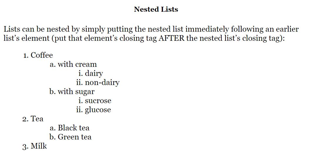 <p>Lists can be nested by simply putting the nested list immediately following an earlier list’s element (put that element’s closing tag AFTER the nested list’s closing tag):</p>