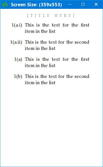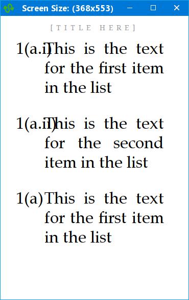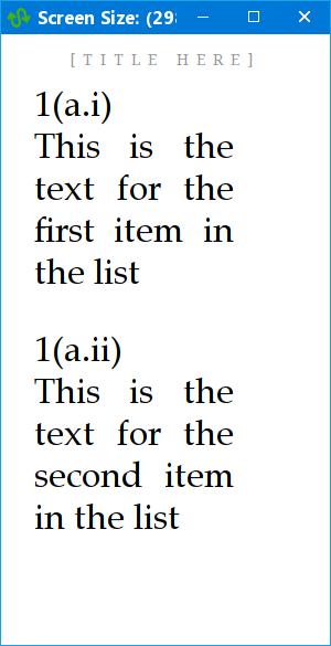 <p class="list"><span class="col1">1(a.i)</span><span class="col2">This is the text for the first item in the list</span></p> <p class="list"><span class="col1">1(a.ii)</span><span class="col2">This is the text for the second item in the list</span></p> <p class="list"><span class="col1">1(a)</span><span class="col2">This is the text for the first item in the list</span></p> <p class="list"><span class="col1">1(b)</span><span class="col2">This is the text for the second item in the list</span></p> Code: