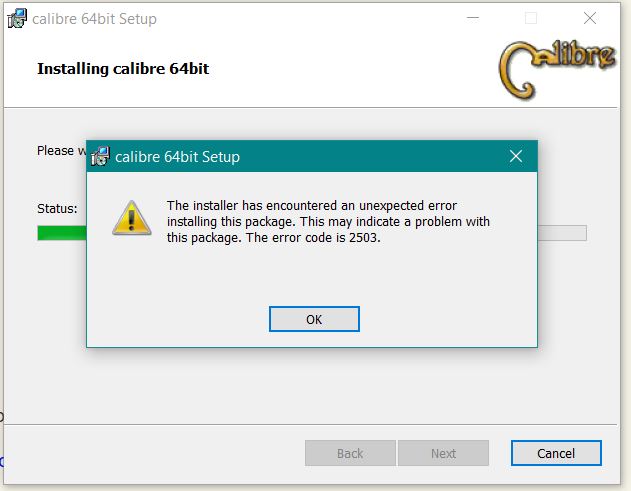 Whenever I try to install Calibre I get the following attached: It says error 2503 (The installer has encountered an unexpected error) Calibre (the installed version works), but I cannot upgrade Any thoughts? |