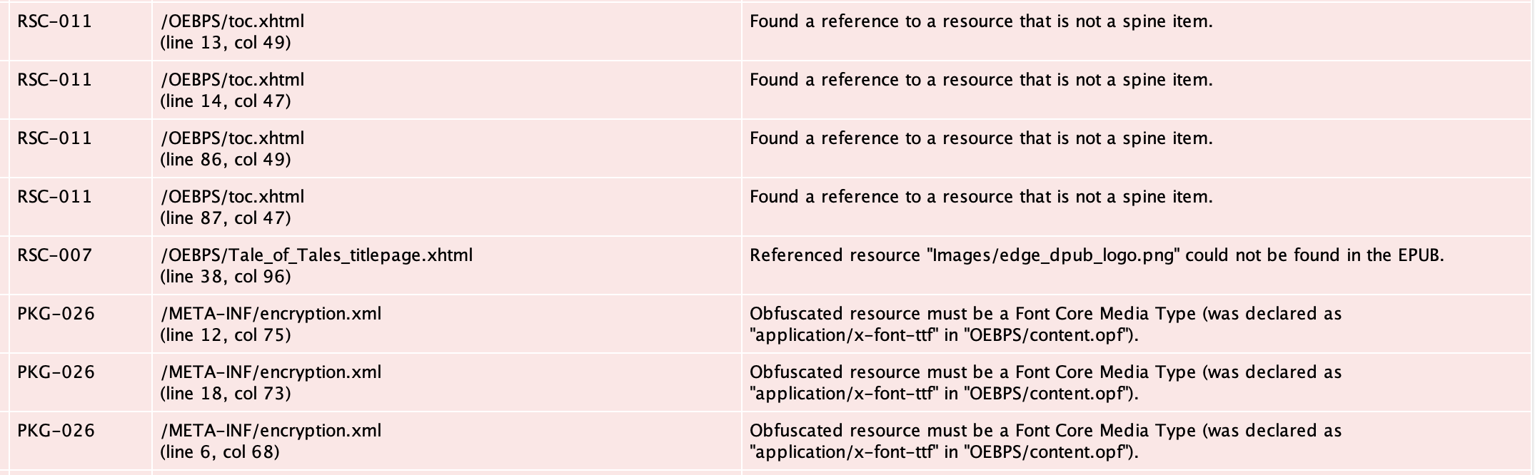 Thank you very much. Now I can also fix the minor errors. 1) RSC-004 file is encrypted, its content will not be checked. Is there a way to fix this? 2) CSS-007 fonts face reference refers to non standard font type. I often see this error message. How can I avoid it? 3) PKG-026 obfuscated resource must be a Font Core Media Type. How can I fix this? 4) When I open Sigil, I see the following message:Warning: The OPF contains missing or unrecognised media types. Temporary media types have been generated. You should edit your OPF to fix these. There are 15 suggestions stating the following: html/_idGenFolder0-Zeza/Assets/Zeza.hyperesources/529072-restorable.plist 'application/x-bplist' -> 'application/x-bplist' I don't understand how I should correct these strings. 5) The logo on the title page is visible, but EPUB-Checker reads: RSC-007 Referenced resource "...logo.png" could not be found in the EPUB. |