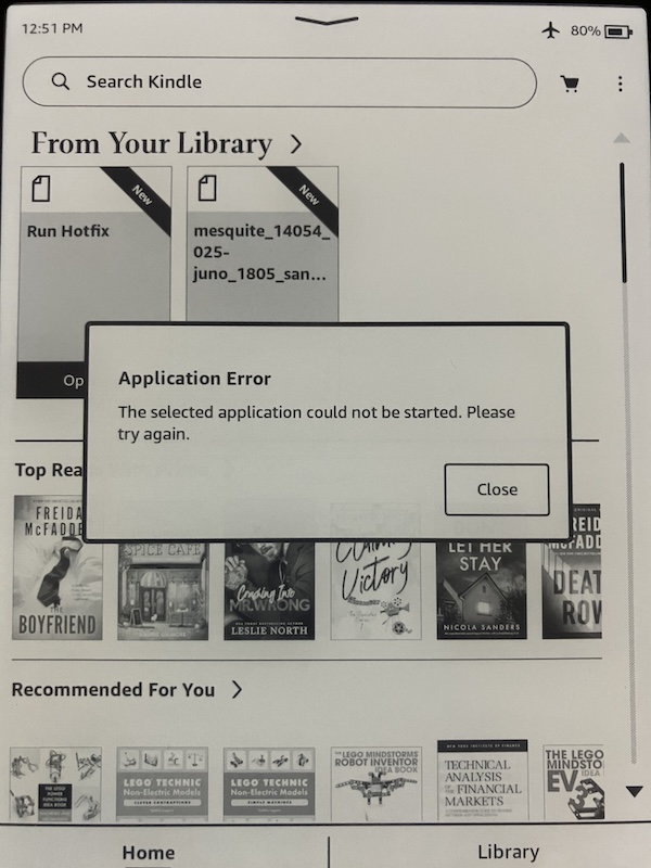 "The selected application could not be started. Please try again." This is a 2024 Kindle Paperwhite running 5.18.5, and I tried reflashing the firmware and doing a factory reset with the same results. Any ideas? Thanks! |