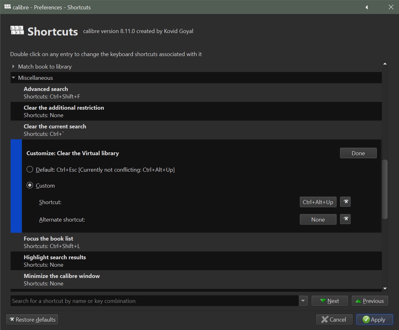 @Kovid - can the VL related shortcuts in the Miscellaneous group be moved to the Virtual library group ? Also suggest the new one be renamed to Switch to last used Virtual library. BR |
