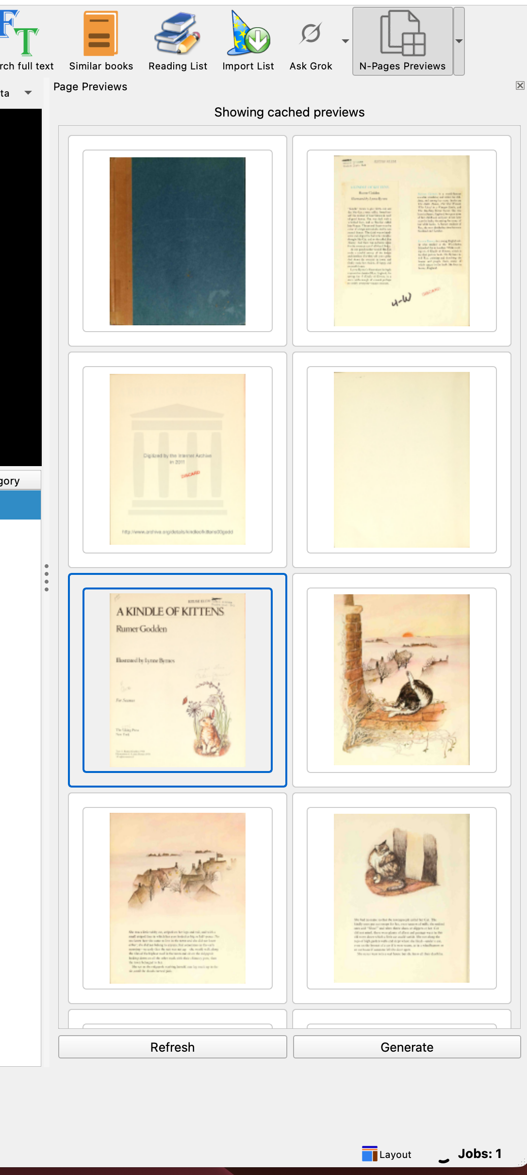 Here is my plugin for calibre: Short description: Plugin let you generate previews for first N pages of the book that allows quickly preview them. My use case is sorting books children books to quickly judge if it is worth to read it or not. without the need to open the book which is not instantaneous. Description Preview Panel: - Two-column thumbnail grid displays the first N pages of the selected book. - One-click on the toolbar icon shows or hides the docked preview panel; Generate Preview: - Either from menu or from floating toolbar you generate previews for one or multiple books. Storage: Preview images live beside the source PDF in a .previews/ folder, keyed by file path, mtime, page count, width, and quality. Ghostscript-backed conversion creates JPEGs; if Ghostscript is missing, the generator falls back to placeholder images so the UI remains usable. No Calibre database tables are altered; settings stay in plugins/n_pages_previews.json. Configuration Options (Preferences → Plugins → Customize) Installation: In Calibre: Preferences → Plugins → Load plugin from file, pick n-pages-previews.zip, then restart Calibre and add the button to your toolbar or menu. Getting Help |
