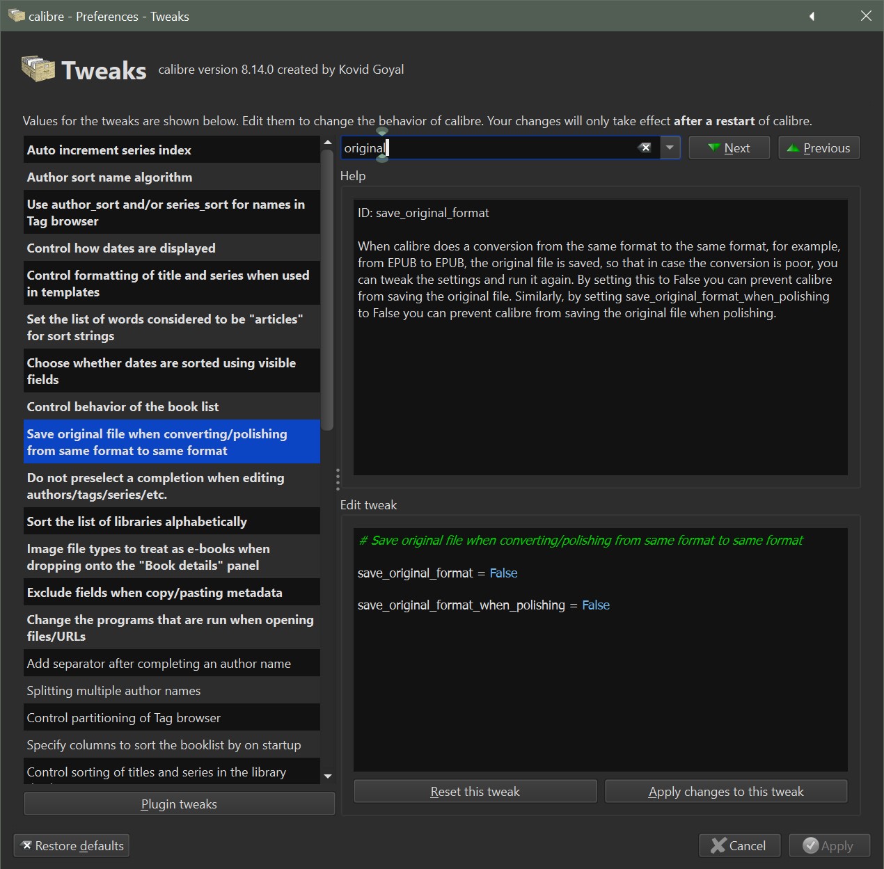 Yeah, that's the option I'm currently using. I was wondering if there's a way to do a bulk search and replace your of thing. If not, then the modify epub tool was going to be my work around. The only thing is it's going to create thousands of "original_epub" files for me to delete and temporarily clog up my hard drive.