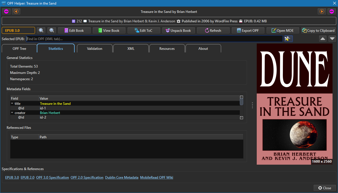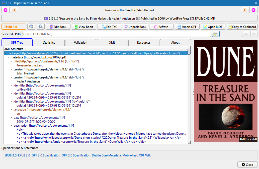 OPF Helper is a comprehensive toolkit for inspecting, validating, and managing OPF files in your EPUB library. It offers advanced search, export, and troubleshooting features to help you maintain clean, standards-compliant metadata and structure in your Calibre collection.