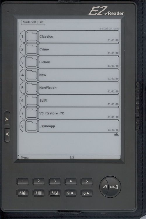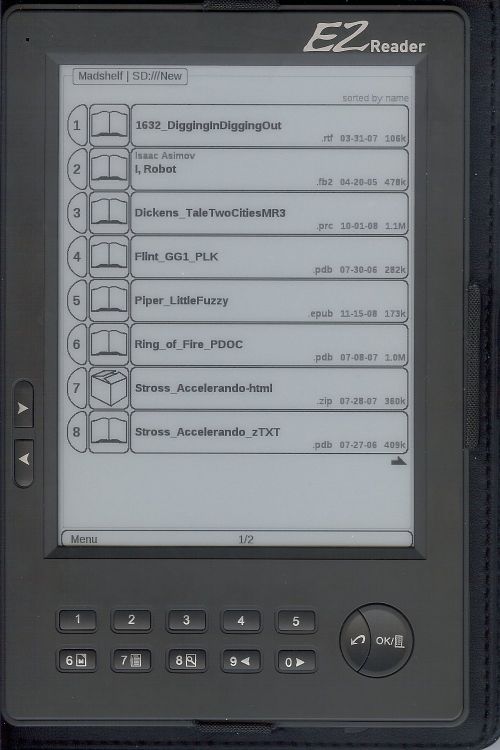 The last post was the same shots from the standard Hanlin V3 firmware. The 1st scan shows my top level directories on the SD card. Note that there is not a "Recent Files" entry and some directories that were "hidden" under the standard firmware show up here. There are once again 8 entries so that they can selected using keys 1-8 (keys 9-0 are page back and forward). The 2nd scan is empty, to line up with the original firmware's "Recent Files" virtual directory. It is actually the "internal" directory listing, illustrating that this is different from the Hanlin's standard internal filesystem (which also contains some ebooks). The 3rd scan is the contents of the "New" directory. This actually contains one ebook for each of many file types. Only the ebook types that are actually supported should be shown. However, OpenInkPot keys only on filename extensions, so file selection isn't perfect. FBReader does support Plucker and PalmDoc and zTXT, the three .pdb formats shown here. All ebook types have the same book icon, and the font used is smaller than the standard firmware (and is too small in my opinion). Only the FB2 ebook is showing the actual title (I, Robot), all the rest are using the filename. This includes the MOBI ebook where the title is easily found (less easy, but also possible, for ePub and some others). The 4th scan is the next (last) page of New. Showing four more ebooks types (TXT, eReader, PDF and CHM). However, eReader is not supported by FBReader or Cool Reader. It is listed because it has the .pdb filename extension, and OpenInkPot isn't looking at the file header to detect the actual ebook type. PDF is displayed using a different reader, and hence the different icon. The 5th scan is the SciFi directory, showing another set of directories, based on author name. Using folder hierarchies (genre/author/series/book) is why folders are so important for large libraries. The 6th scan is the Pournelle directory, showing the 1st eight ebooks. These are in filename order, and (as MOBI files) are showing the filename rather than its title. Overall, I prefer the icons and the text size used by the standard Hanlin firmware (in fact, an even larger font would be better). However, either implementation is "good enough" to be usable. |