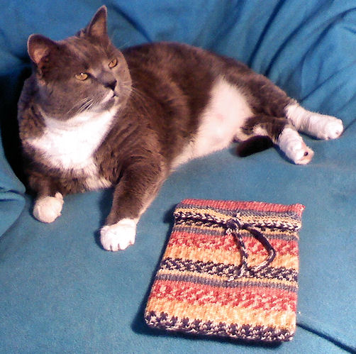 Knitted in the round on size 3, started with 80 stitches. Knit in stockinette stitch until 1 inch before desired length. Switched to garter stitch on the front and continued in stockinette stitch for another inch. Cast off garter stitch portion and continued in stockinette stitch to make a flap (first two and last two stitches done in garter stitch). Knit the last inch of the flap in garter stitch. Knit 2 I Cords for a closure.