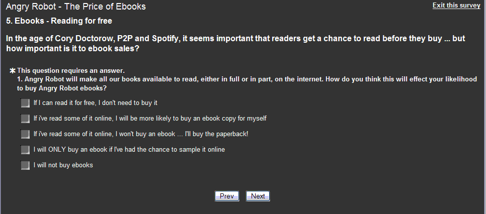 I took the survey, but there was one question I absolutely could not answer honestly. I tried to skip it, but was told "This question requires an answer". To the question "Angry Robot will make all our books available to read, either in full or in part, on the internet. How do you think this will effect your likelihood to buy Angry Robot ebooks?" I wanted to reply "I don't read books on my PC." Instead, I was forced to pick one of their prepared answers that assumed everyone is willing to read books or book samples on the Internet. See the attached image for all the choices they offered.