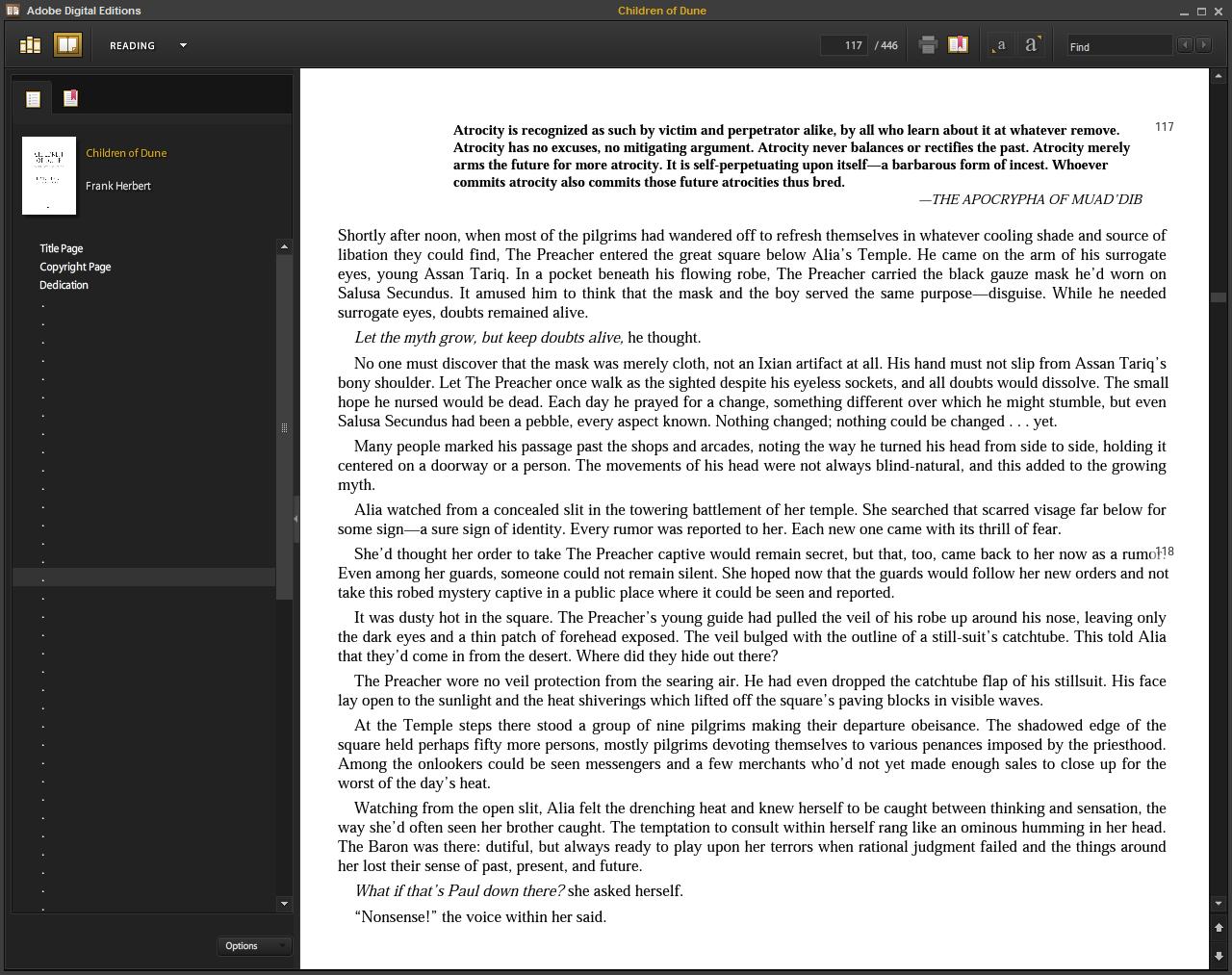 I just checked out Children of Dune from the library in ePub. It's terrible. It has no proper cover and the cover it has is a duplicate of the front page in lower resolution. The paragraphs have spaces between them. There are no chapter heading differentiating the chapters so in the ToC we have