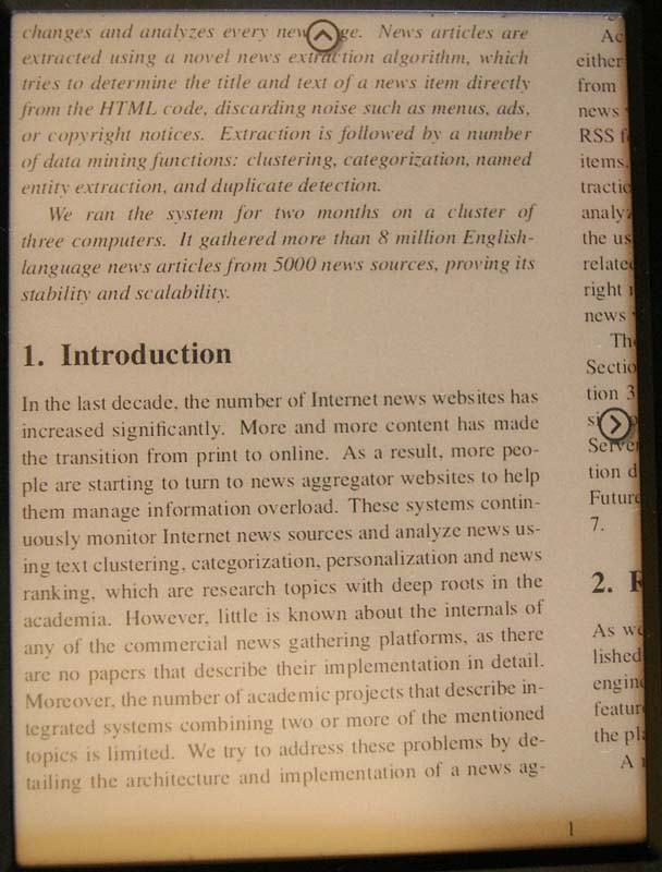 Portrait viewing (first picture) is useless - font too small - and it’s just what every 6” eBook reader will show. Reflow is useless (second picture). If this is an example of the reflow PDF output from the reader, it’s a disgrace, the one in the Sony (505 or 700) is way much better - never seen a reflowed PDF in me 505 so messed up, and for sure never with the letters “on top of each other” like it’s shown in the image. Landscape viewing is acceptable, but again you can obtain this reading experience with all the 6” eBook readers who support PDF. The Sony 505 and 700 are great as they “cut” the page in 2 and thus give a half of page each time, the Cybook is more difficult as one must test several “zoom” options until finding the correct correlation between enough font size and page navigation. So I do not see why the eSlick is so special (besides the bad reflowing), and others are offering something very similar for quite some time now. If you want, you can post here the same paper and I can text it in the 505 and the Cybook and post the results, so you can compare. Best regards, |