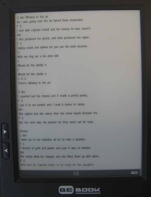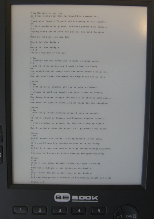 I have waited couple years now right product to appear to the market to support my needs. Around 30 years I have used papers for music playing (chords, notes, tabs, lyrics, etc.). What I have done for years is that I have put each song to one A4-size format, so that none of the songs would be more than one A4-paper size; horizontally or vertically. This is mainly to avoid need to turn pages while playing. Instead of paper, I would like to use e-reader. Tablet PC is another possibility, but I don't like slow start ups and other PC features. I would also use the e-reader for books and documents, not only for music, but the music usage is the reason to acquire it. It's a standard to use 'Courier New' -font (size 10) on music documents. This is due to the font's ability to keep the position (in proportion to other lines) when changing the size of the font, etc. Well, if wee look at the following, we see we don't have so much possibilities for the music purpose (big screen): https://wiki.mobileread.com/wiki/E-book_Reader_Matrix The problem: Since it is almost impossible to test this without having the device to my home first, I did yesterday a small test. I cut to the A4-paper 6 inch rectangle to test on PC could this 6" size "screen" manage to zoom those 'Courier New'-font music documents, when changing the font size so that all text on A4-size document would be visible. So, I held this paper against the computer screen while changing the font size on Word document. It was possible, but the font size was really small on this 6" area. Of course I don't know now does the e-reader do it in a similar way, or does it process text somehow. So, my problems is now that I don't know if the 6" e-reader is big enough for my purpose. Particularly I'm interested on Sony PRS-700 because of its functionalities in zooming, etc. I was wondering could anybody advice me on this or do even a test with following. Copy following (trad.) song to Word document on your PC with 'Courier New' -font size 10. Transfer it to your e-reader and see if it is possible to have whole song in readable format on 6" screen. Another possibility is also 10,2" iRex screen. ====== C Am Whiskey in the jar As I was going over the far famed Kerry mountains, F C I met with Captain Farrell and his money he was count'n. Am I first produced me pistol, and then produced me rapier, F C Saying stand and deliver for you are the bold deceiver. G With me ring am a do ama dah C Whack fol the daddy o F Whack fol the daddy o C G C There's whiskey in the jar C Am I counted out his money and it made a pretty penny, F C I put it in me pocket and I took it home to Jenny. Am She sighed and she swore that she never would deceave me, F C But the devil take the women for they never can be easy. Chorus C Am I went up to me chamber all for to take a slumber F C I dreamt of gold and jewels and sure it was no wonder, Am But Jenny drew me charges and she filled them up with water, F C And sent for Captain Farrel, to be ready for the slaughter. Chorus C Am 'Twas early in the morning before I rose to travel, F C Up comes a band of footmen and likewise Captain Farrell; Am I first produce my pistol, for she stole away my rapier F C But I couldn't shoot the water, so a prisoner I was taken. Chorus C Am And if anyone can aid me, 'tis my brother in the army, F C If I could learn his station in Cork or in Killarney. Am And if he'd come and join me we'd go roving through Kilkenny, F C I'm sure he'd treat me fairer than my own sporting Jenny. Chorus C Am There's some takes delight in the carriages a rolling, F C Some takes delight in the hurley or the bowlin'. Am But I takes delight in the juice of the barley, F C And courting pretty fair maids in the morning bright and early. Chorus x 2 ====== You may noticed that here the song's text lines didn't keep the position in proportion to other lines, meaning the chords are not in the right place according to lyrics. Sorry for the long the post. Thanks a million in advance for any comments that can help me - and others as well - on this. |