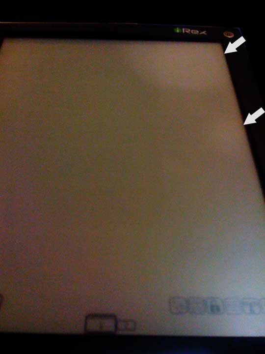 My iLiad starts to develop darker screen! As you can see in the attached image, two spots only on the screen now retain their original color while the rest of the screen became darker. The contrast ratio drops because of this and reading becomes more difficult. Is there anything I can do to solve this or should I send it to iRex for fixing?