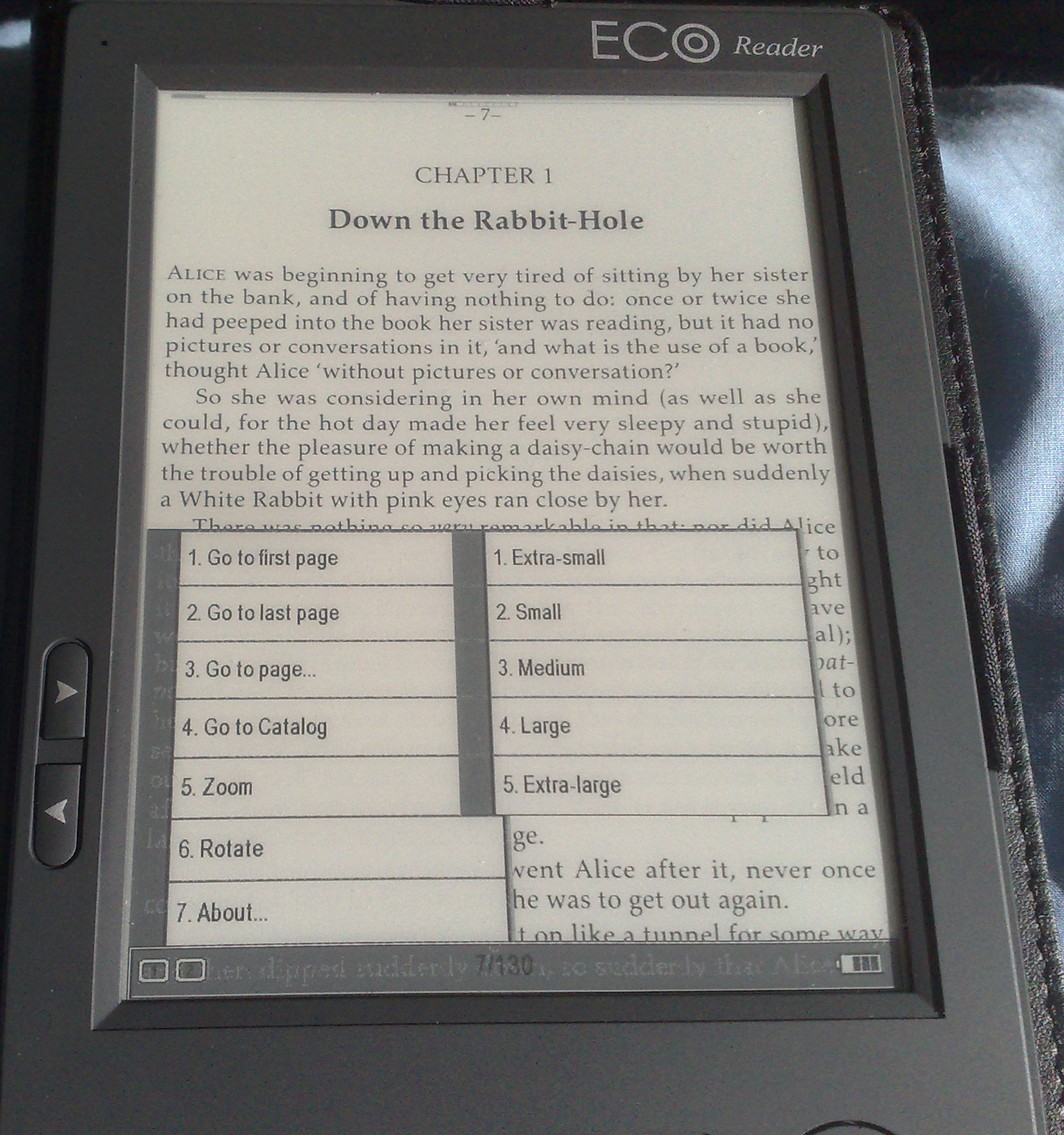 Attached, from the left: Jellby's Alice in Wonderland PDF showing the menu. Pride and Prejudice, tagged PDF version, zoomed x 2 and zoomed x 4. Last edited by cbell; 08-08-2009 at 02:39 AM. |