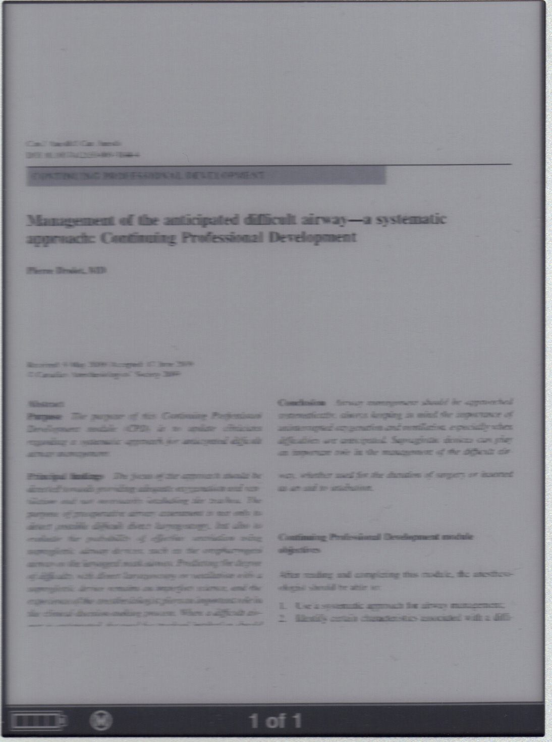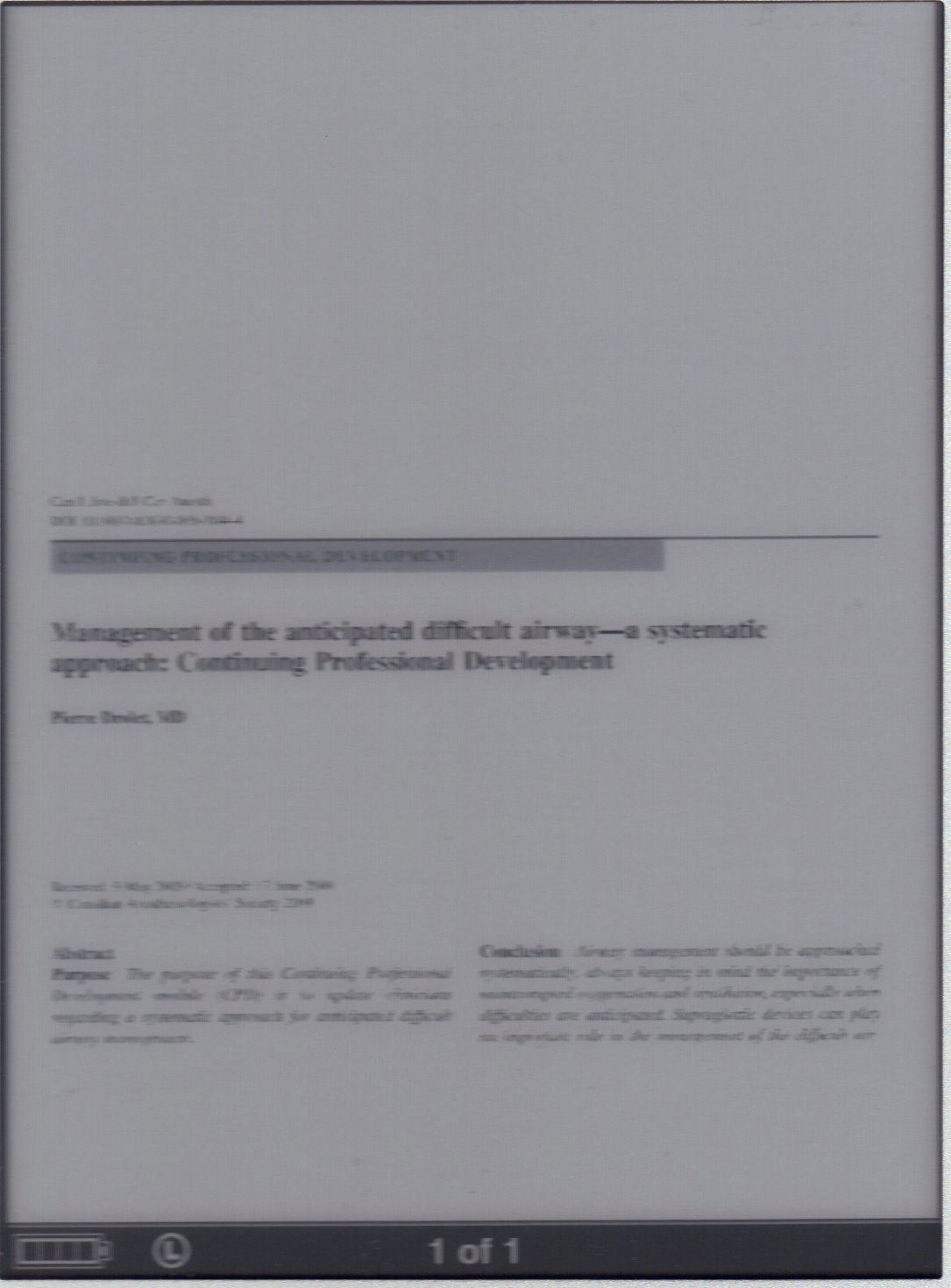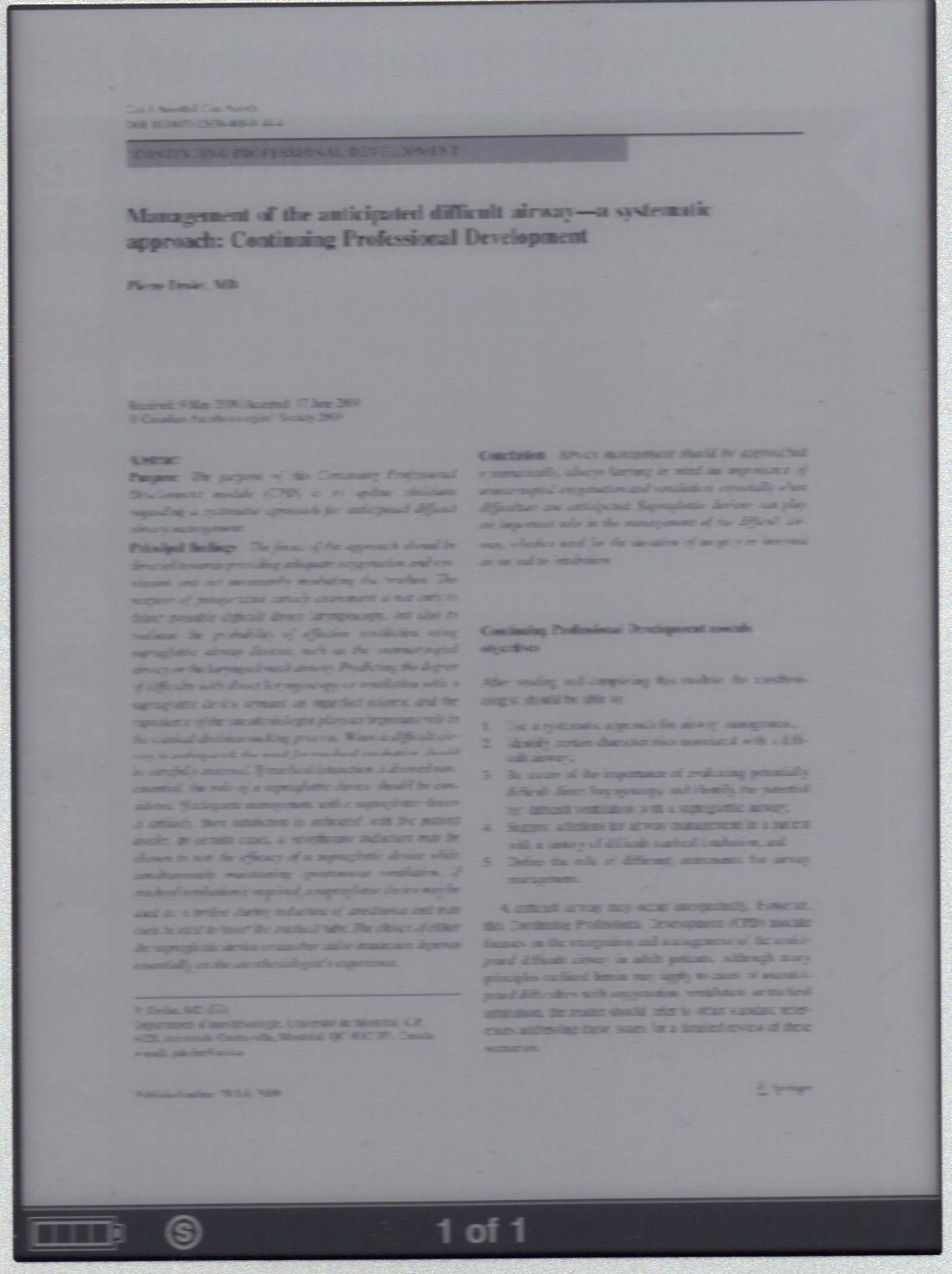 I am looking to get the sony prs505 ereader. I will use it mainly at work to read both books as well as pdf research articles. As I understand, the pdf files cannot be zoomed or manipulated at all, you basically open it in your reader and it fits the whole page on the screen. Is there someone that is willing to open the attached first page of the pdf file on their reader, take a photo and then post it again. I do need to see how big it is displayed before I buy the reader. No use getting it if I will not be able to read it. Many many thanks. Nico de Bruin |