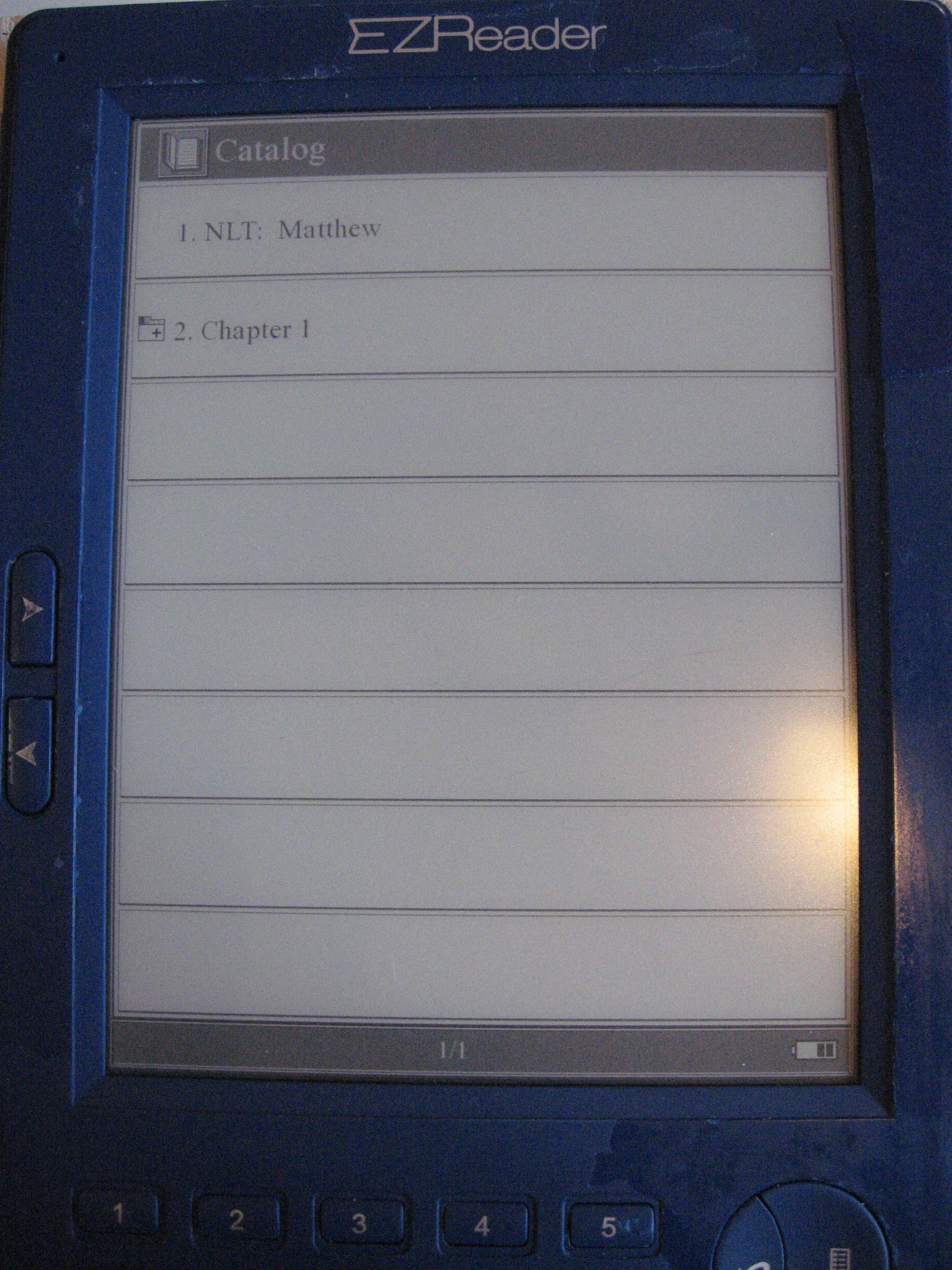 I found my favorite format, easily made with my software, is a pdf published by my WordPerfect with 4x6 page size and 14 point text. Anyway, in my WordPerfect, I use the "Headings" which provide the "links" when I "publish" the pdf with the proper settings. Well, I was trying multi level headings, Heading 1 for the book title and heading 2 for Chapters, and I decided to try Heading 3 for some subunits. When I published the document to pdf and read it on my PEZ I was pleasantly surprised. On the "Catalog" page, the Heading 1 shows up with an icon beside it. When I choose that level, the subheading then open up, like the + and - in the folder options in Windows. When I choose again, the subheadings close up. The first picture is the file, NLT Matthew (Christian Bible), then I show the Catalog page shown when I press button 7. It shows Matthew with an icon. I press number 1 and get the subheading of the Chapter 1. I pressed its number and get the next level of subheadings. (sorry, I loaded them in a different order) Oops, my granddaughter got in there ![]() AJ Last edited by AJ Starr; 10-07-2009 at 11:11 AM. |