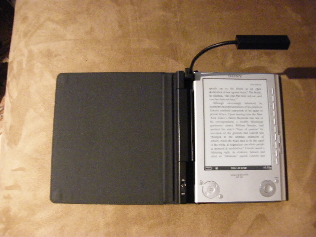Things that may take getting used to: - heavier. Enough to notice when holding the Reader in one hand. - light reflects off the Reader's topmost silver trim, or off the top of the e-ink screen surface, much of the time I've used it. I have to tilt it to remove that reflection, but I myself tilting it in normal use back to these bad reflecting positions. - less comfortable left hand holding. The first two are minor problems. The left hand holding is a problem for me so far. The original cover had perfect left hand holding balance. Light in weight, with a balance point that has your thumb falling on the page-turning circle, and the left hand cover is controllable in the crook between your thumb and index finger (I preferred holding it like a regular book with the cover halves at about 90 or 110 degrees, but I could effortlessly tilt the left hand cover at other angles). Balanced and comfortable. Like a regular book. But the PRSA-CL6's left hand cover is situated a good inch away from the Reader, to make room for the light. And that one-inch additional margin is also filled with the extra weight of the light. So the balance point is changed, and the cover's spine has moved leftwards an inch. To have your thumb on or near the page turning circle, situates the left hand cover way too far to the left to be controllable. Now I've got a floppy left hand cover (unless you prefer folding it back on itself). For two-hand holding, it's fine. For one hand holding, it's fine if you fold back the cover. And it's fine if you prop it up various ways. For one-hand holding where you don't fold back or prop up the left hand cover, it flops. I loved the left hand holding comfort of the original cover. It was one of my favorite features of the Sony Reader. You may not have such a strong preference for that feature. (For a reference point, my previous light was incredibly light and clipped on the leftmost side of the left hand cover. I needed to keep that left hand cover angled correctly to aim at the page, which wasn't hard given my holding habits. Its light output wasn't as good as the PRSA-CL6's.) |