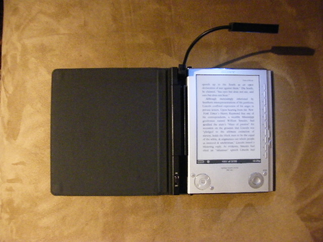 I've used the Mighty Bright flex travel light and tried the PRSA-CL1 (lightwedge). This solution, in my opinion, provides good light with no glare on the 505. The light itself folds aways easily and the cover is very nice. It's faux leather, but is of very high quality. Much more rigid than the original cover. I completely recommend it for a clean, integrated solution. This cover fits the 505 like a glove. |