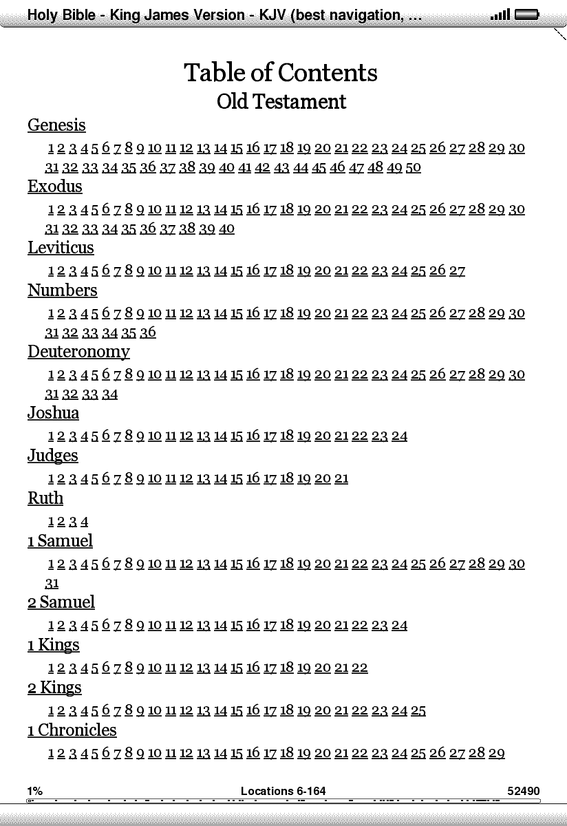 A short story: You can purchase the most useful electronic Bible currently available for the Kindle at www.osnova.com. The easy way to find it on your Kindle is to search for the word "osnova" in the Kindle store. Please do not use the sample generated automatically by Amazon (it cripples most of the features of the book). If you need a sample download it right here. To learn how to use all of the features, please read the text below. A quick note: at this time, I do not guarantee that all features will work on Kindle 1 because I do not have access to it. A longer tale: After looking at almost all versions of the Bible available for the Kindle, I was not satisfied with any of them. I am not just a casual reader of the Bible (when you pick up reading right where you left off the previous time). I need to be able to turn to a specific verse anywhere in the Bible at a moment's notice while studying a specific passage, reading a theological book or listening to a sermon. As a result, even the versions with the hyperlinked tables of contents were not sufficient for me. I have come up with the Direct Verse Jump technique, which allows you in a couple of clicks’ worth of seconds to open any verse in the Bible. Moreover, almost all versions that I could find do not preserve the formatting and delete some of the text that I find in my paper copy of the Bible (for example, italics, small caps for "LORD", the headings of many Psalms, or the Hebrew letter names in Psalm 119, KJV notes at the end of some of the Paul's epistles). So, I have decided to make another Kindle version of the Authorized Version to correct all of these issues. It has been a long haul, but now I am ready to share this version with you. Features of this Kindle KJV Bible, which has the same text as your paper copy: