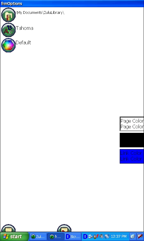 I've installed the ZuluExpress on my JE100 (WinCE5.0) and while it does work (perfect installation), there are some problems (see attachment). Also, the text continues behind my taskbar... If I hide my taskbar, the bottom margin is non-existing and that makes the last line difficult to read. (the setup screen still looks the same as in the attachment). |