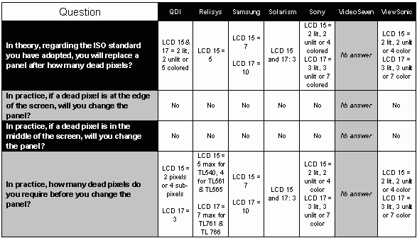 On Tom's Hardware page you find an interesting article on LCD displays and the fact that there are still no real specification available (how many dead pixels does it take before the manufacturers agree to replace a monitor).
