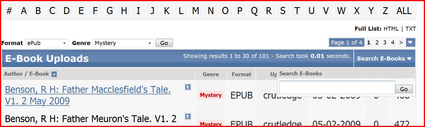 Click "ebooks" and the drop down menu shows options. You can choose "ePub" for the Sony. And you are taken to this page. You can choose the type genre you want from the drop down menu. I chose mystery and the list comes up from the beginning. On the right is a search option to look for specific books or authors. Just type it in and the search will bring it up. I typed in "doyle" and clicked "go". I hope this helps. Last edited by dreams; 01-03-2010 at 07:56 PM. |