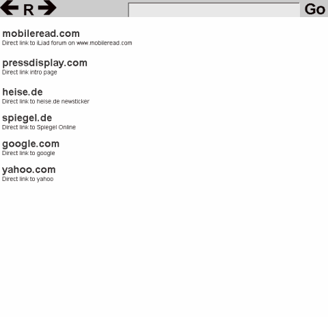 What's it good for: You can browse the web. The hack enables networking permanently, the html file provides an address bar where you can enter www.mobileread.com, or whatever. How does it work: The pdf contains links to the Iliad's internal programs to start networking. Other than with the iDS update thing, the network will not be disabled after a minute, but stay active until you reboot. Then, the html viewer can display online websites. Because it has no addressbar to enter addresses, there's a html file that simulates one. Question answered? |
