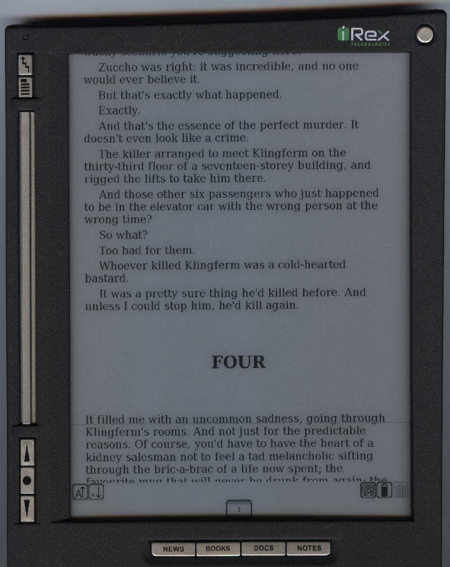 Both show the same book made with font size 120% (14pt). The first pic shows how the book looks when first loaded and the second pic shows how it appears when I opted to increase the font size. I find that HTML files take a looooong time to open. The top and bottom lines are often cut off. I really like the fact that the iLiad will increase or decrease the font size - the device takes a lengthy time to do this but once achieved the pages flip along quite nicely while reading. I will continue to convert to PDF for my reading until such time the HTML issue had been addressed. Note: my apologies for the poor quality scans - they don't do the iLiad screen justice - it really is a thing of beauty. Last edited by Moonraker; 08-22-2006 at 08:30 PM. |