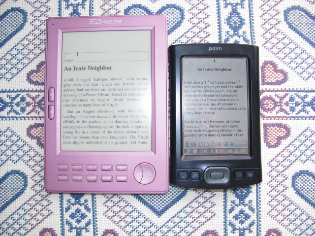 ![]() Let me start by saying, I love it! I really think this was a wise purchase for me. I bought it mostly for all the free books in Public Domain. I'd been reading on my old Palm T/X, but it seems to be on its last leg. And seeing as how I rarely used that for anything other than reading, I decided to look into an ebook reader. When I first started looking, the most important thing to me was size. One reason I read so often on my Palm is that it is small and easily fits in my purse, so I can read anywhere. I wasn't really interested in Kindle, although in my initial research the Nook looked interesting. I liked the fact that it worked with so many file types, but once I saw the dimensions I decided it was just too big. It also seemed to have a lot of wasted space, with that touch screen at the bottom. I wasn't interested in wi-fi, since I'll mostly be downloading free books. So their wireless bookstore wasn't really a benefit to me. After I found these forums, I started looking for other options. At first I was interested in the Sony Pocket, as the price was right, and the size was much better than the Nook. Then I found out about the Pocket Pro. It's just a little smaller, but that little bit was enough to make a difference for me. The numerous file formats seemed nice, but since I'm new to ebook readers I wasn't sure I'd really need all of them. The mp3 player seemed like it could be a nice feature, but it wasn't a main selling point. I mostly liked the small size, and the fact that it had an expandable SD slot. These were the two biggest selling points for me. And the fact that it comes in purple was an added bonus. Once I saw the Pocket Pro in person at Car Toys, that cinched it for me. We also went out to Borders that day so I could see the Sony, but I really liked the feel of the Pocket Pro over the Sony. The Sony just seemed so hard and cold, but the Pocket Pro was more comfortable to hold.Now that I've had it a few days, I know I've made the right decision. I do like the feel of the reader. I've loaded a few songs onto it to try out the mp3 player. It sounds fine, and I'll probably use it now and then, although for the most part I'll stick to my current mp3 player. (The thing I like about this as opposed to my mp3 player is it's a lot easier to pick a song, since I can see them all in the menu. My mp3 player doesn't have a very good menu.) Being left handed I don't use the scroll wheel as much as some people would, although it is nice to have 3 options for page turning. The book marking feature is nice, as is the way the folders work. At first when I loaded books from Calibre I had way too many folders, so I had to go back and rearrange the way I had it load books. It was just a matter of trial and error to figure out the best way of making folders, for my needs. The page turns seem plenty fast to me. When I had first started reading about ebook readers I was afraid the page turns would be painfully slow, but it doesn't seem that way, at all. I have noticed there are a few things that would be nice to have, as others here have mentioned. Things like a way of deleting books from the device, or a way of seeing how far into the book I am. I would also like a way to highlight, but I don't know how that would be possible without a touch screen. Those things are just minor... I wouldn't want to trade the Pocket Pro in for another device that would do them... that would be too much of a sacrifice. I much prefer the Pocket Pro to a touch screen! ![]() Well hopefully this isn't too long and rambling of a post, but I just wanted to share my thoughts. I am really enjoying my new ebook reader (or Eagle Breeder, as my kids call it, because that's kind of what "ebook reader" sounds like to them ), and after showing it off to my MIL, she is thinking of getting one. She really likes the small size of it as well, plus the ability to change font size for her aging eyes. ![]() Oh, the other thing that really helped me to make my decision is the support I've seen here on the forums from Robertb. It's rare to see a company offer this much customer service, but that was a major selling point for me, as well. So the main selling points for me were: