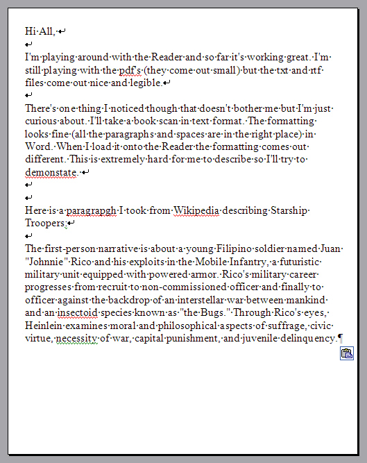 I'm playing around with the Reader and so far it's working great. I'm still playing with the pdf's (they come out small) but the txt and rtf files come out nice and legible. There's one thing I noticed though that doesn't bother me but I'm just curious about. I'll take a book scan in text format. The formatting looks fine (all the paragraphs and spaces are in the right place) in Word. When I load it onto the Reader the formatting comes out different. This is extremely hard for me to describe so I'll try to demonstate. Here is a paragrapgh I took from Wikipedia describing Starship Troopers: The first-person narrative is about a young Filipino soldier named Juan "Johnnie" Rico and his exploits in the Mobile Infantry, a futuristic military unit equipped with powered armor. Rico's military career progresses from recruit to non-commissioned officer and finally to officer against the backdrop of an interstellar war between mankind and an insectoid species known as "the Bugs." Through Rico's eyes, Heinlein examines moral and philosophical aspects of suffrage, civic virtue, necessity of war, capital punishment, and juvenile delinquency. If I load it on the Reader it comes out like this: The first-person narrative is about a young Filipino soldier named Juan "Johnnie" Rico and his exploits in the Mobile Infantry, a futuristic military unit equipped with powered armor. Rico's military career progresses from recruit to non-commissioned officer and finally to officer against the backdrop of an interstellar war between mankind and an insectoid species known as "the Bugs." Through Rico's eyes, Heinlein examines moral and philosophical aspects of suffrage, civic virtue, necessity of war, capital punishment, and juvenile delinquency. See how the sentence gets cut off and goes to the next line all of a sudden? I hope I explained this clear enough. I'm horrible at this. This happens in rtf format as well. Do I have to play around with the Page Layout settings? I know where that is in Word but would anyone know where I can find this in OpenOffice? Thanks for your time all. -C |
