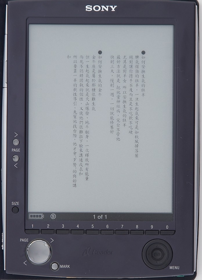 I appreciate very much that you spent a lot time to test those files and tell us the results so rapidly. The photos you took are very beautiful. Are you a professional photographer? ![]() I think the reason why JP1 and up_down_CN zoomed to "M" are quite readable is because the two files have optimal layout and font size for the size of the display of Sony Reader. (I originally edited them for my (6.4", 640*480 pixel) EBK reader.) The regular letter/A4 PDFs are really problems to most of the ebook devices since the mismatch of the layout size of PDFs and the display size of devices. Can you rotate the JP2 into the 'half page' mode? I think the basic problem is that the algorithm of Sony Reader to deal with the small size text. If the small size text can be dark rather than gray, it would be good. Oh. Adding a zoom in/out and scroll function for the PDFs, such as for the pictures, would be the best. Finally, do the Sony Reader support the CJK filename well? How many bookmarks can one book have? Do TOC and internal hyperlinks of a PDF work well? How fast is the time of loading and rate of paging the CJK PDFs (equal to an English one does)? Thanks again. Last edited by segatang; 10-04-2006 at 10:25 PM. |