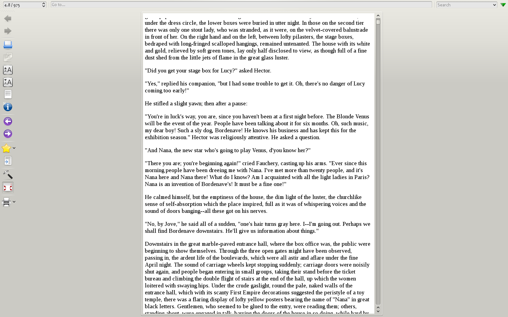 Full screen is a great feature and being able to adjust the view width is also great. However, I like to try and get the "book feel" when reading by PC, and don't want to be distracted by my task bar, or any other menu bars while keeping the light emitted from my screen to a minimum. Which is why I though a "lights out" feature would be good, since a user can basically change the background color around the reading pane to anything they desire, in my case black would be preferential. Thanks again for Calibre, your work is fantastic. |